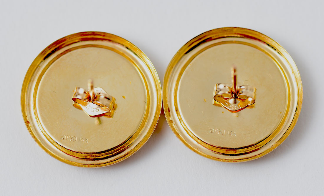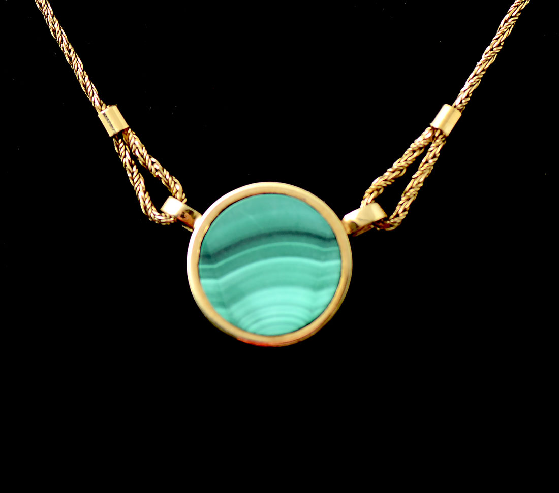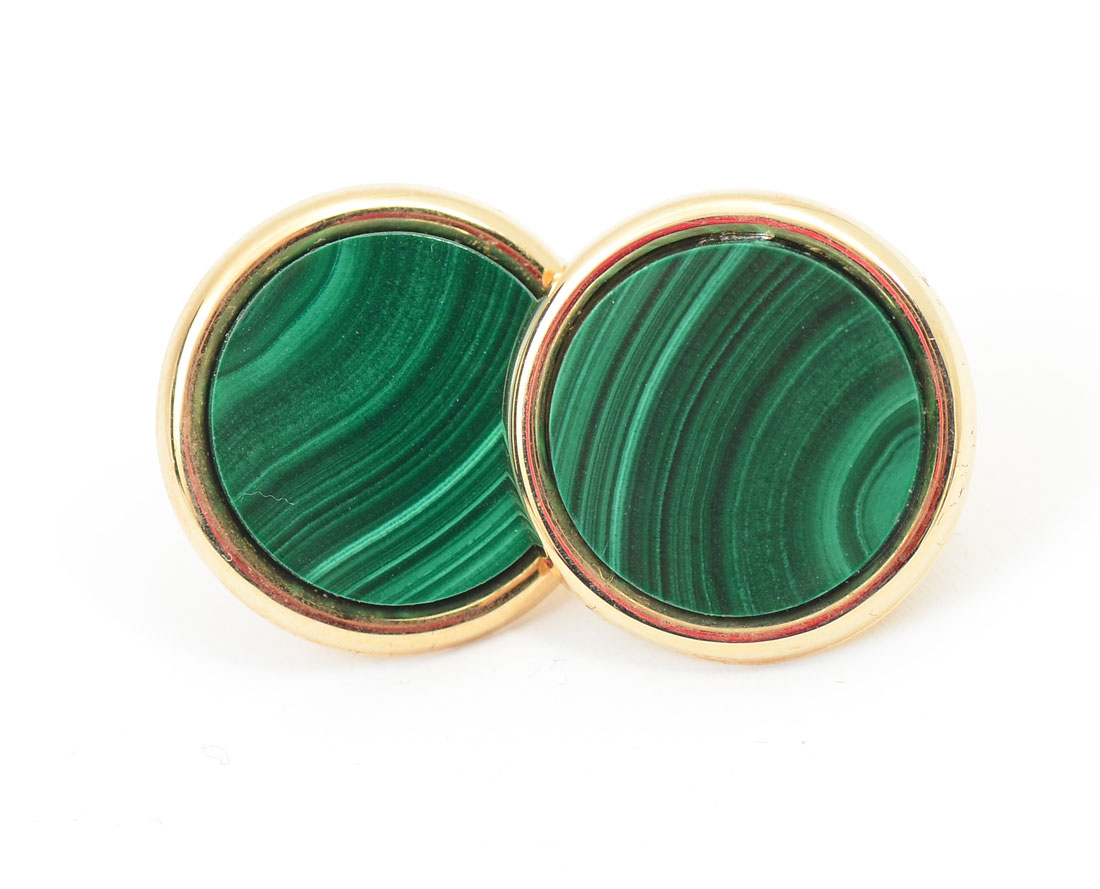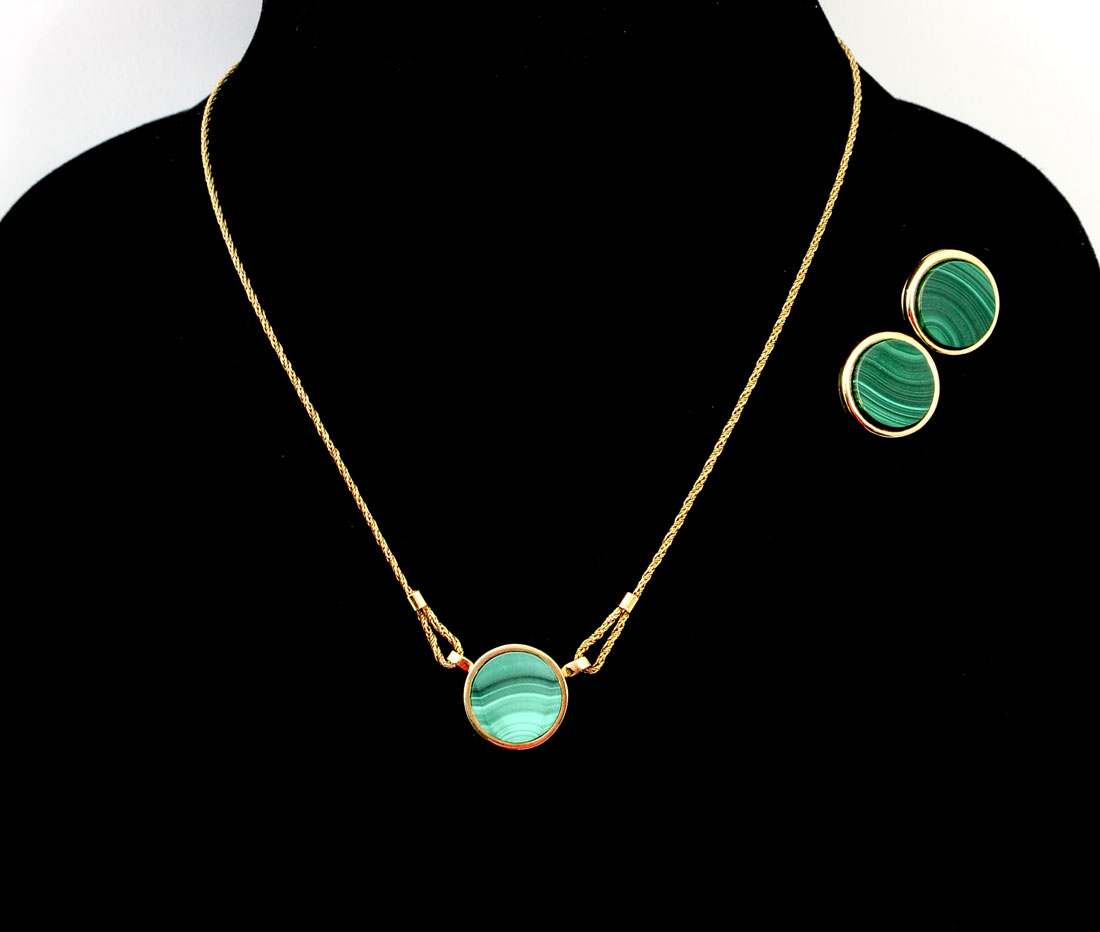 14K MALACHITE NECKLACE & EARRING SET: 14K yellow gold necklace and earring set containing 3 15.00 mm round malachite tablets. Length: 17''. Gold weight: 10.5 grams approx.