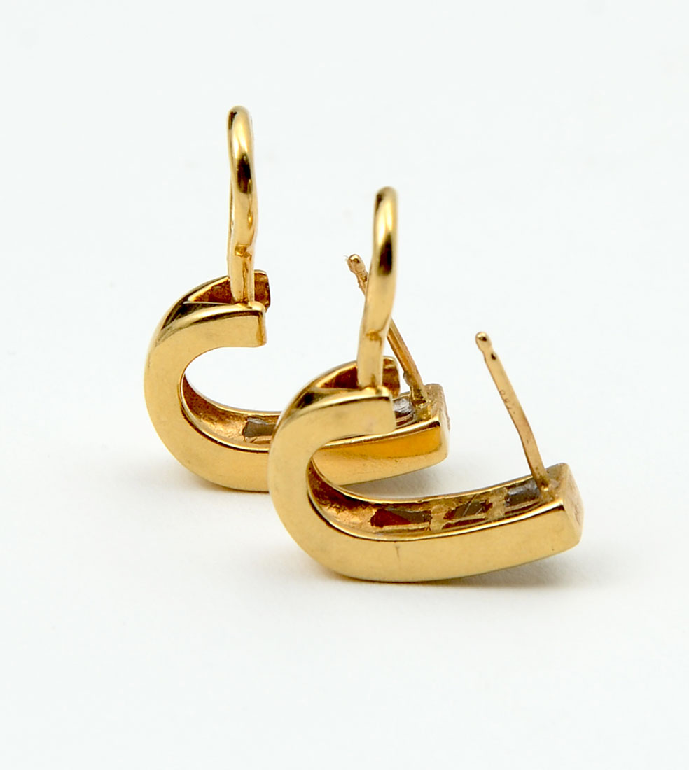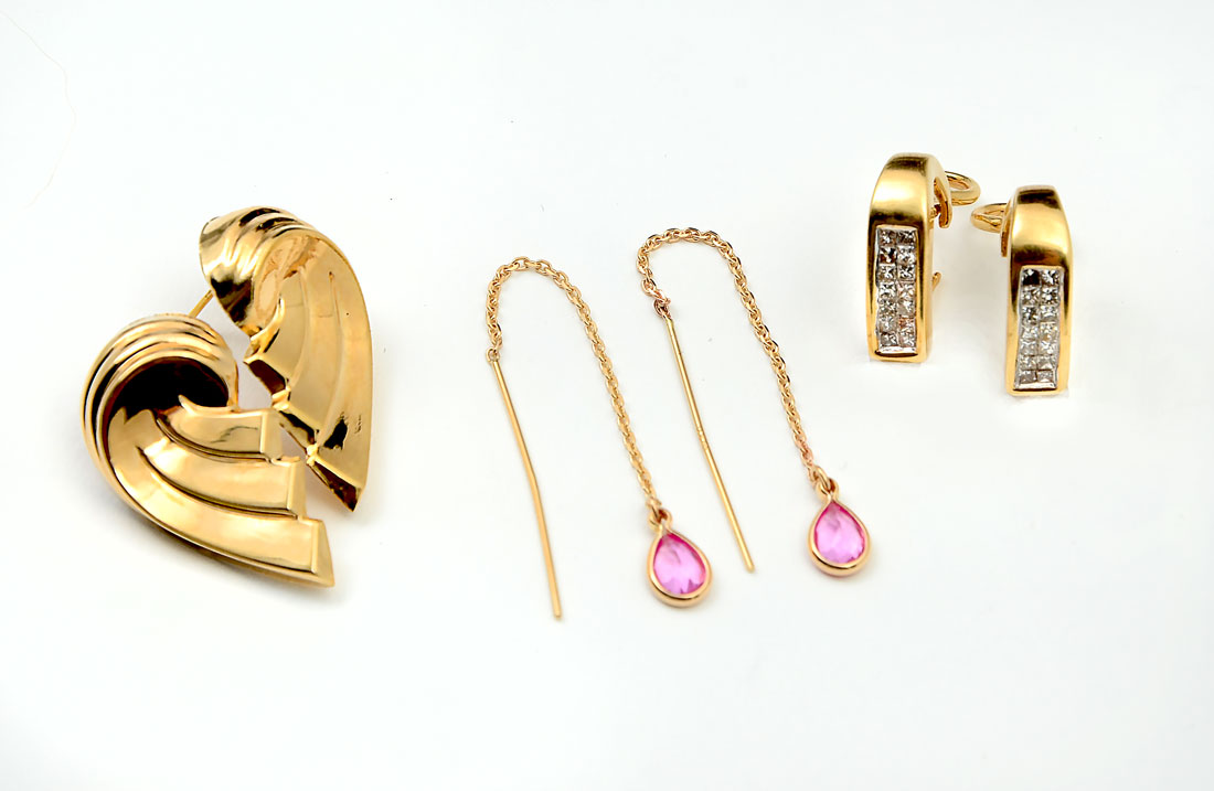 3 PAIR OF YELLOW GOLD EARRINGS: 2 pair of 14K yellow gold earrings. Diamond weight: .45 Ct. Approx. SI in clarity and H-I in color. Pink stones of unknown origin. 1 pair 10K; 10K weight: 1.5 grams 14K weight: 7.3 grams.