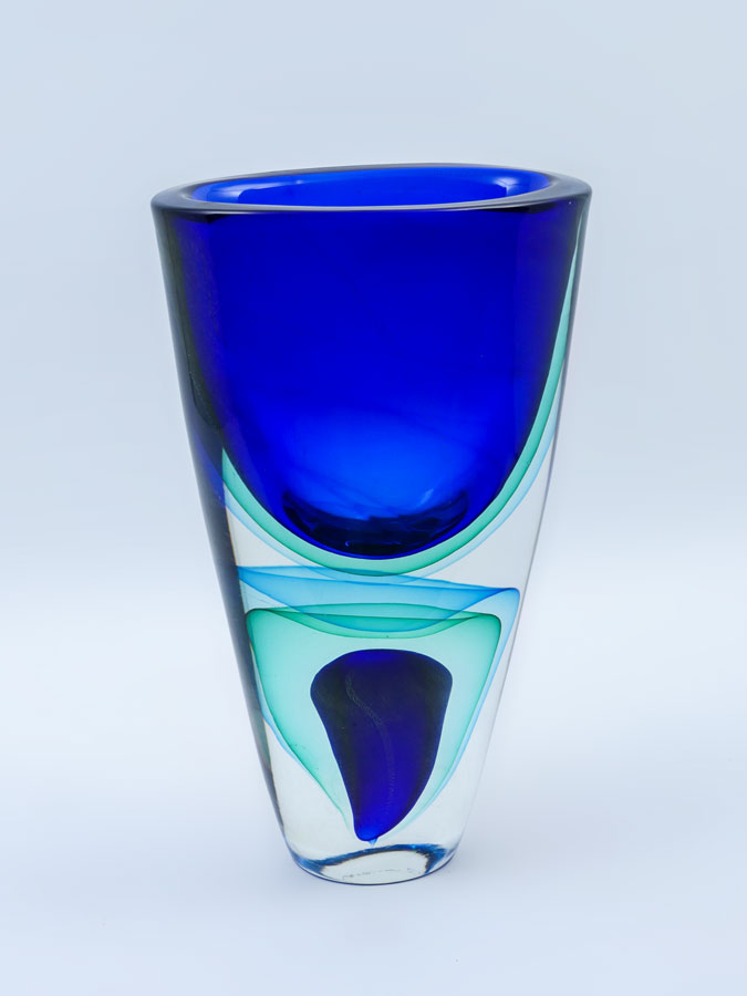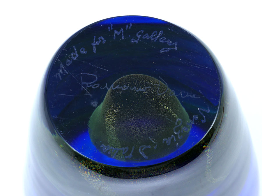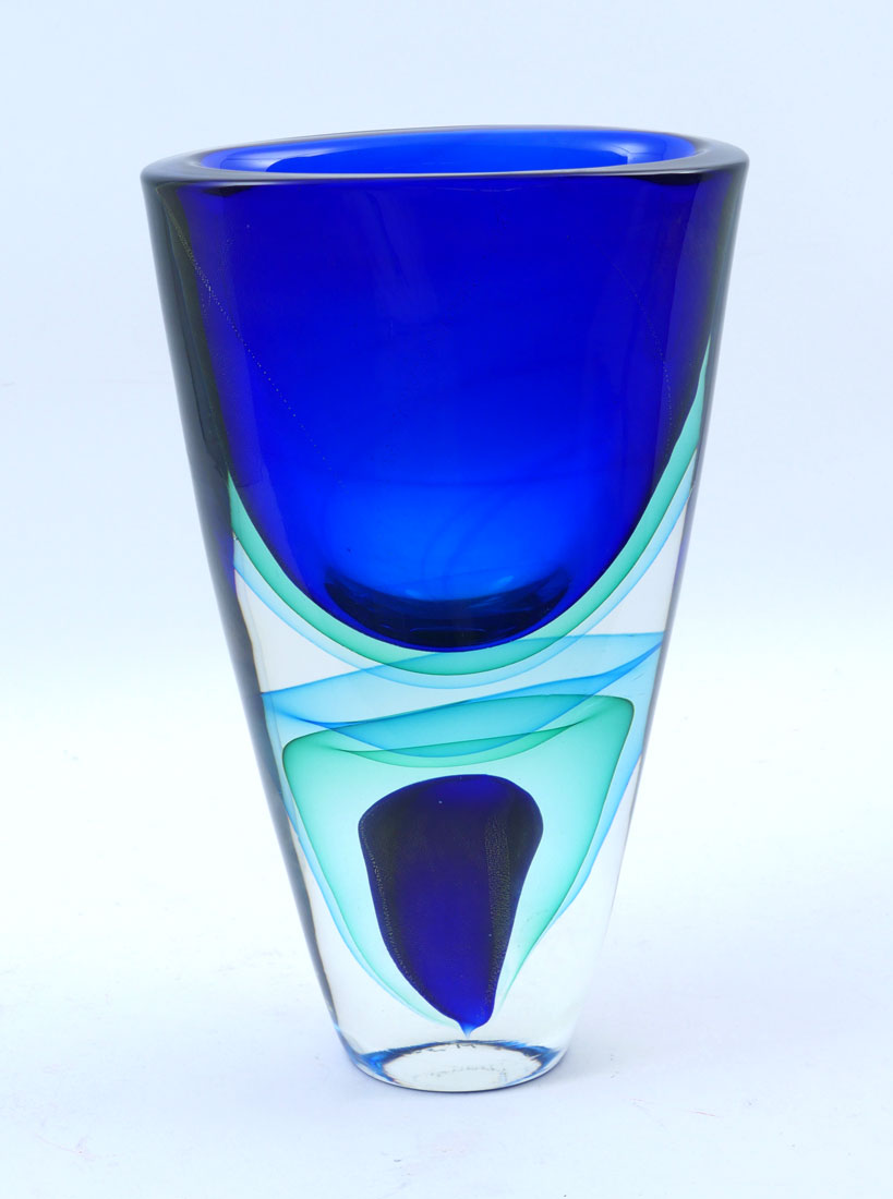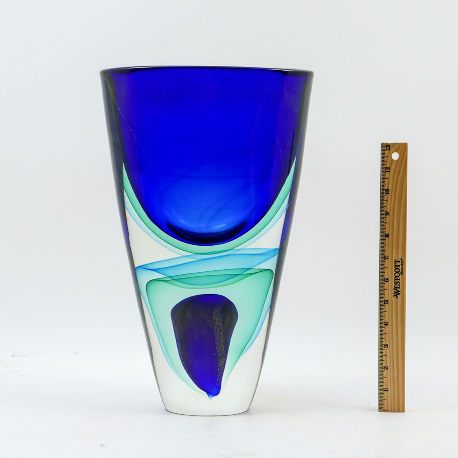 ROMANO DONA MURANO GLASS VASE: Cobalt blue, greens, and clear glass, tapered oval form, signed on base ''Romano Dona'' and dedicated '' Made for ''M'' Gallery, Venezia, Italia''. 15 1/2'' h. x 9 3/4'' x 6''.