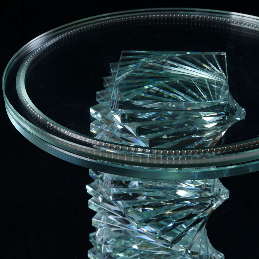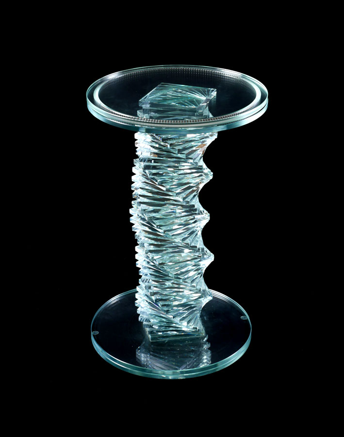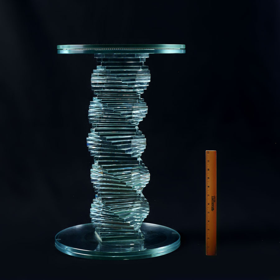 ROTATING TOP CUSTOM GLASS PEDESTAL: Twist pedestal support comprised of individual stacked squares of glass, lazy susan top with ball bearings to rotate glass. Measures 24'' h. x 15 1/2'' top dia.