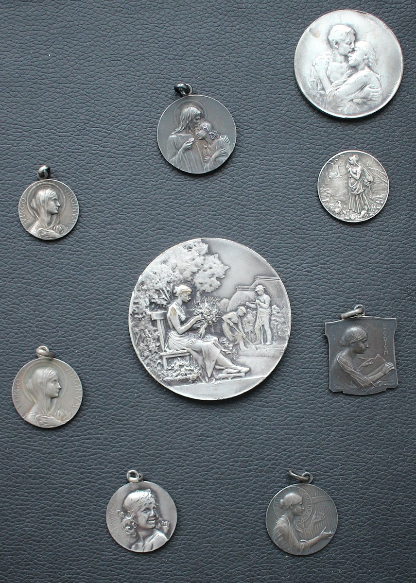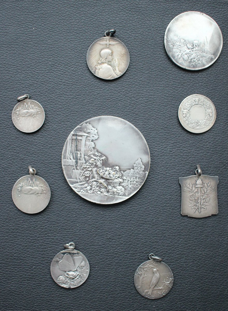 9 PIECE FREDERIC VERNON MEDAL LOT: VERNON, Fredric, (French 1858-1912): Silvered Bronze and silver medals, the largest measuring 2.7'' diameter, the smallest is at .75''.