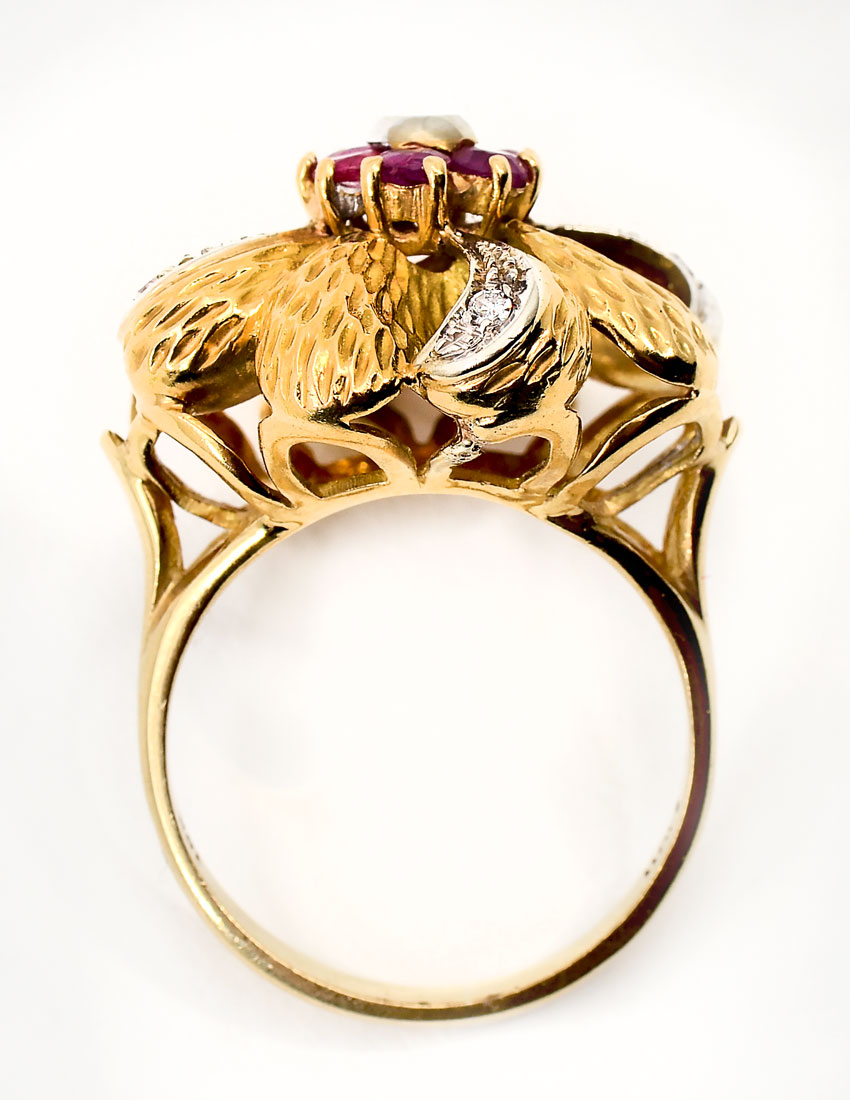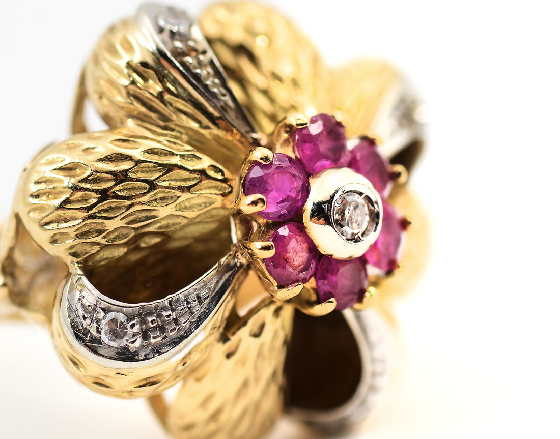 18K DIAMOND MID CENTURY RUBY & DIAMOND RING: Unique Italian made dome ring features approx .30 CTW diamonds set in white gold and 6 rubies circle a single bezel set diamond in the center. Weighs 9.6 grams. Size 7