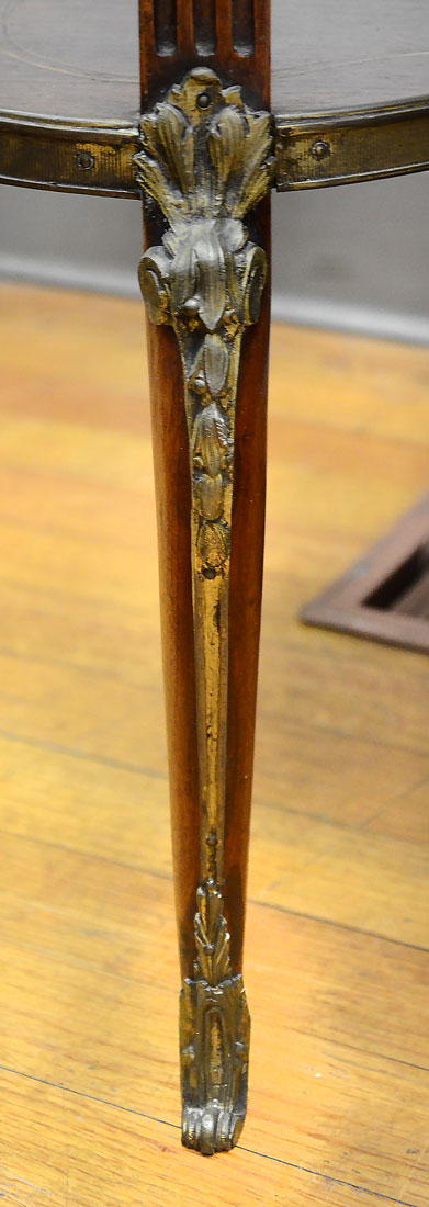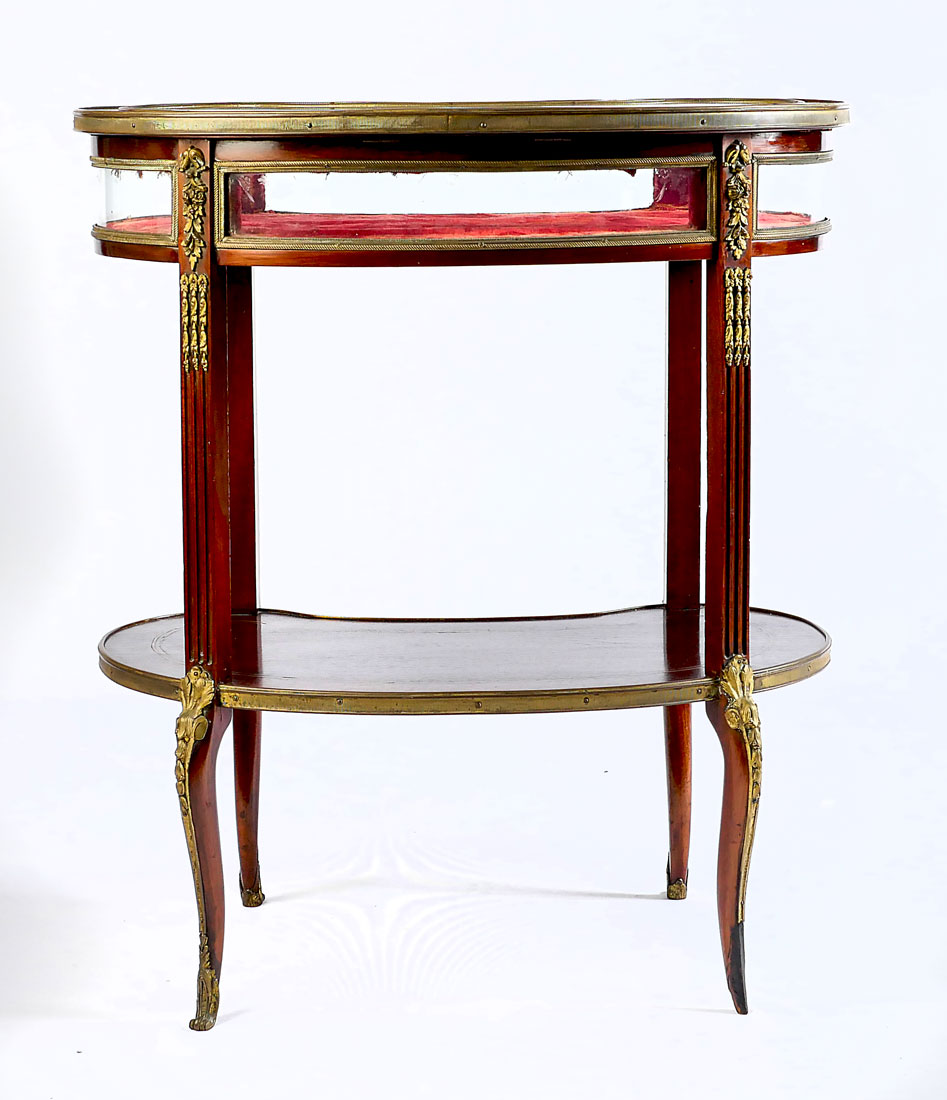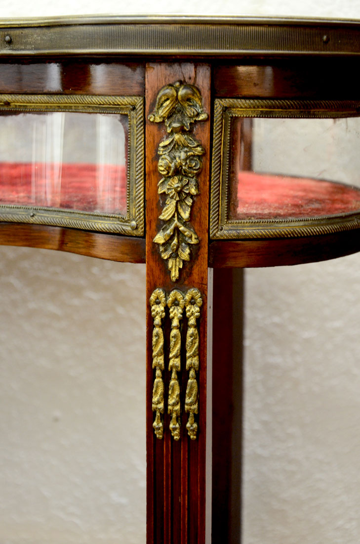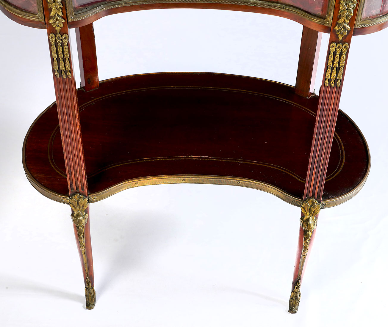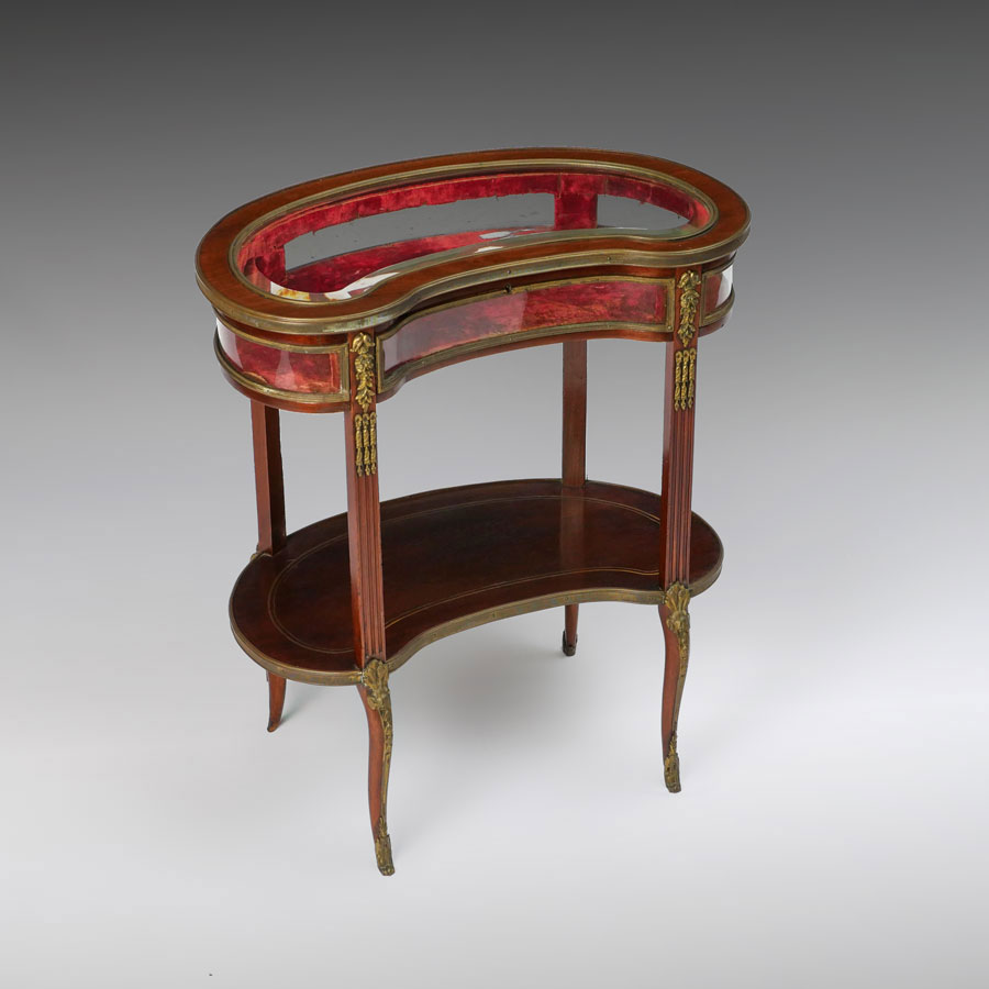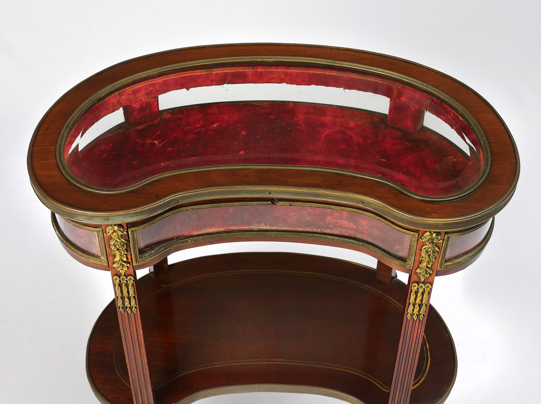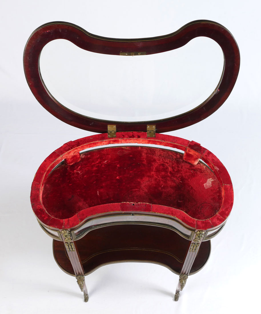 FRENCH LOUIS XV STYLE TALL VITRINE TABLE: Kidney shape tall table, inset beveled glass top and regular glass sides, felt lined interior, string inlaid open lower shelf. Shaped legs with cast metal accents and mounts. 30 1/2'' h. x 26 1/4'' x 16''.