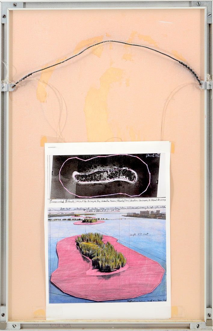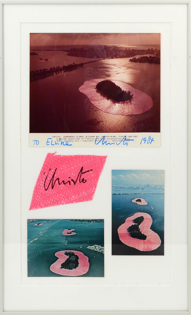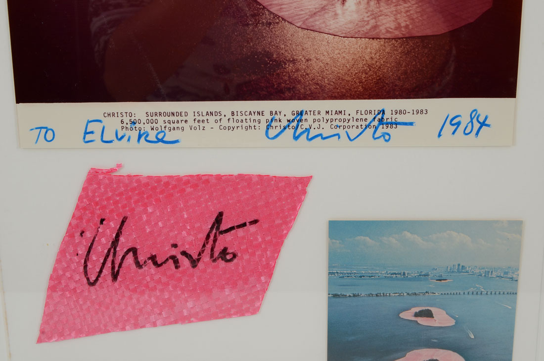 CHRISTO COLLAGE SURROUNDED ISLANDS: Framed items to include a signed and dedicated photograph of surrounded islands, a piece of one of the islands and two additional photographs, all framed and in one that measures 21.50'' x 15''.
