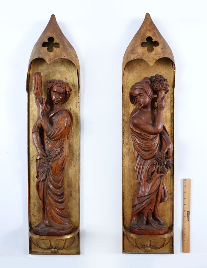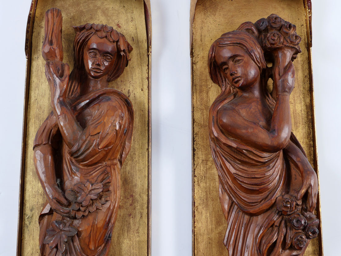 PAIR ITALIAN METAL & CARVED WOOD WALL HANGINGS: Pair of similar but not identical carved wood sculptures of women, affixed to gold decorated metal casings. Older Made in Italy paper tag in back. Overall 38 1/4'' h. x 8 1/2'' x 3 1/2''.