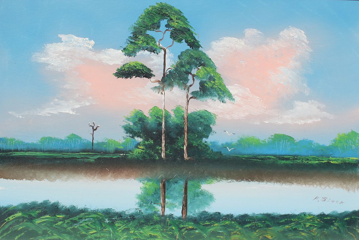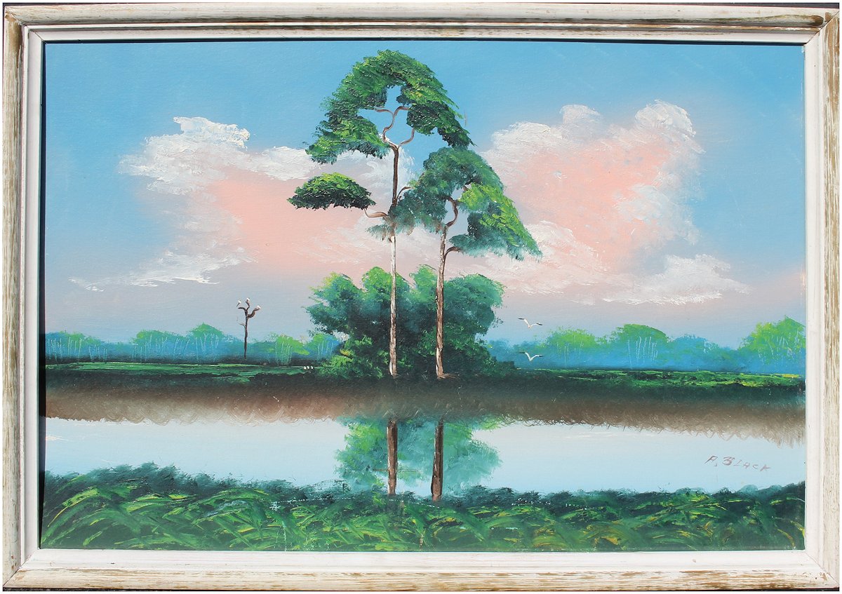 BLACK, Al, (American, 20th Century): Early Florida Highwaymen backwaters scene with stand of cypress trees and birds, Oil/Canvasboard, signed lower right, 24'' x 36'', framed 26'' x 38 1/4''.