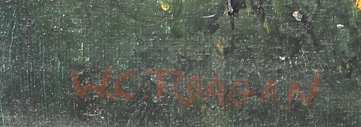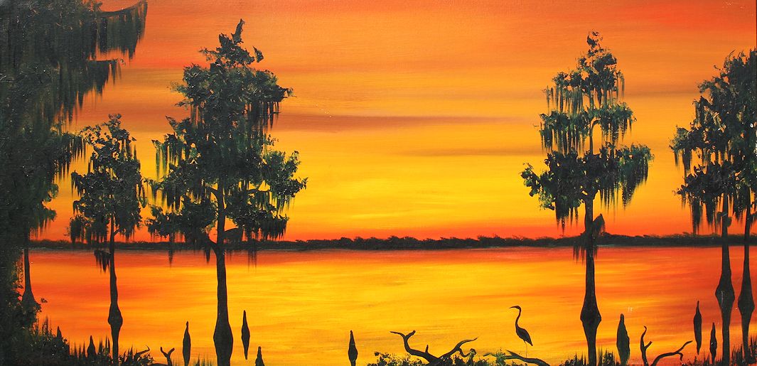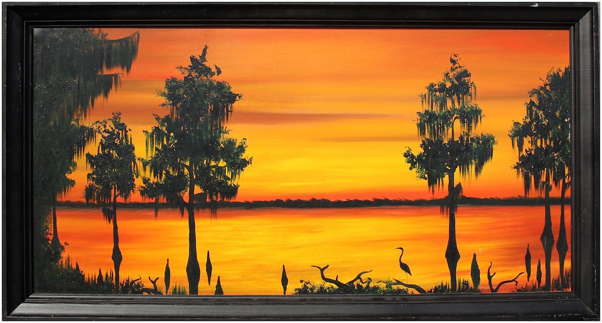 REAGAN, Willie, (American, 1944-): Vibrant Florida Highwaymen sunset scene on the Indian River with trees and heron, Oil/Upson, signed lower left, 24'' x 48'', framed 28'' x 52''.
