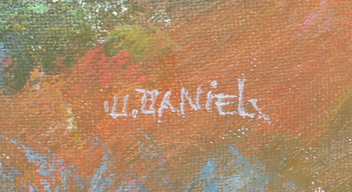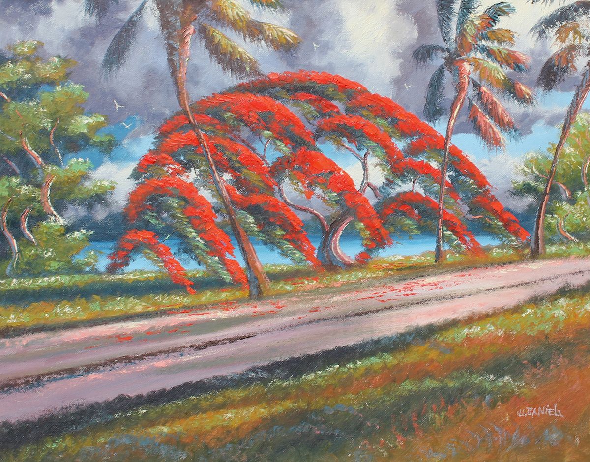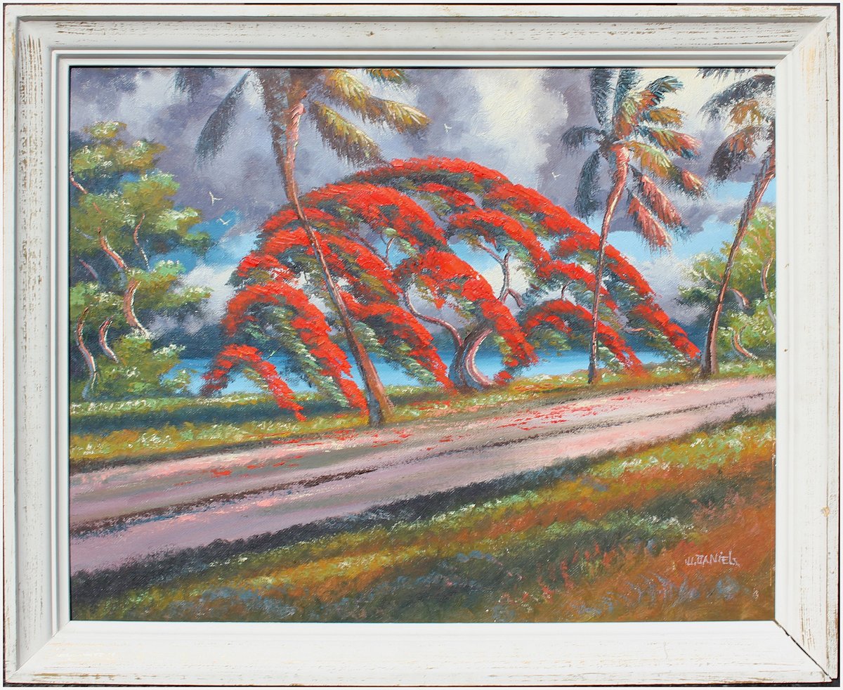 DANIELS, Willie, (American, 20th Century): Florida Highwaymen Vibrant Royal Poinciana at waters edge, Oil/Masonite, signed lower right, 24'' x 30'', framed 27 1/2'' x 33 3/4''.