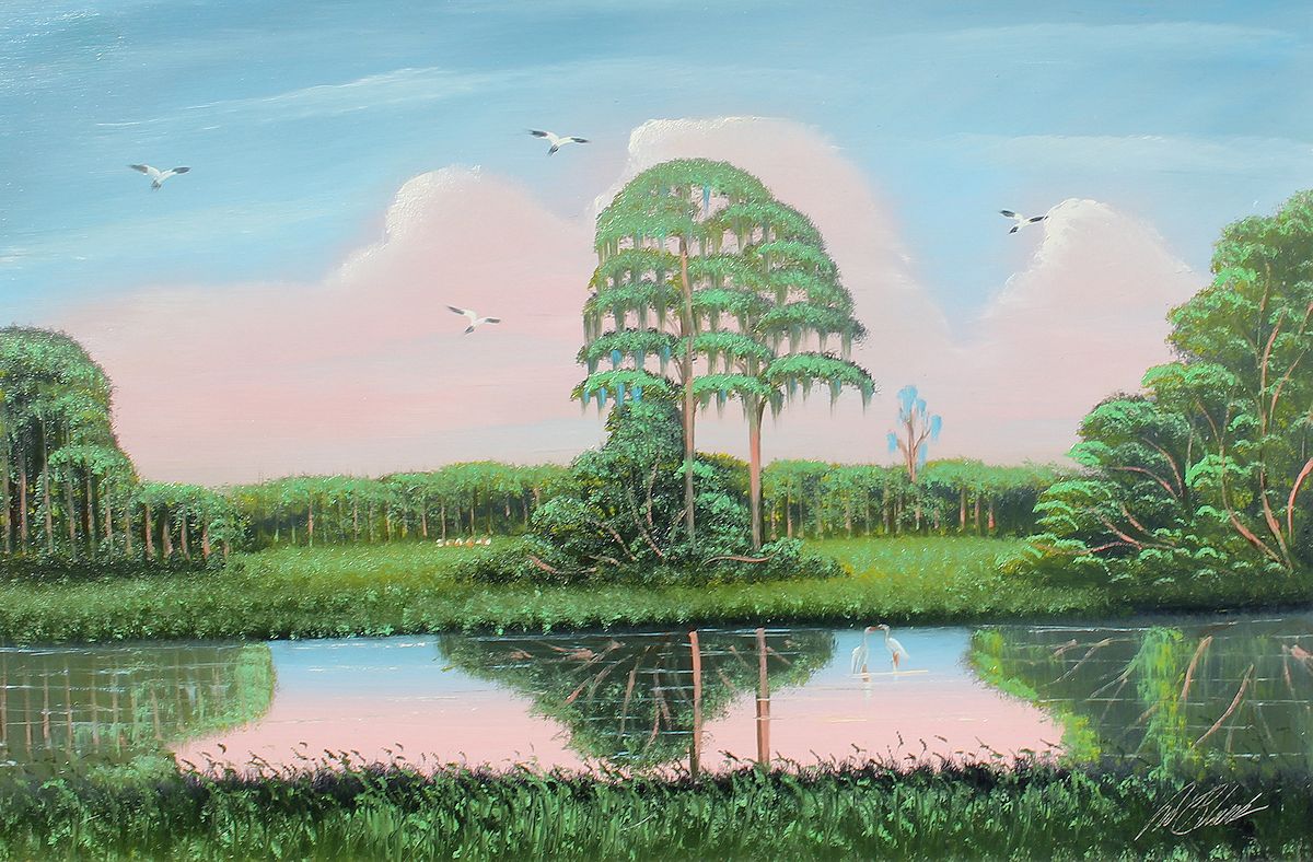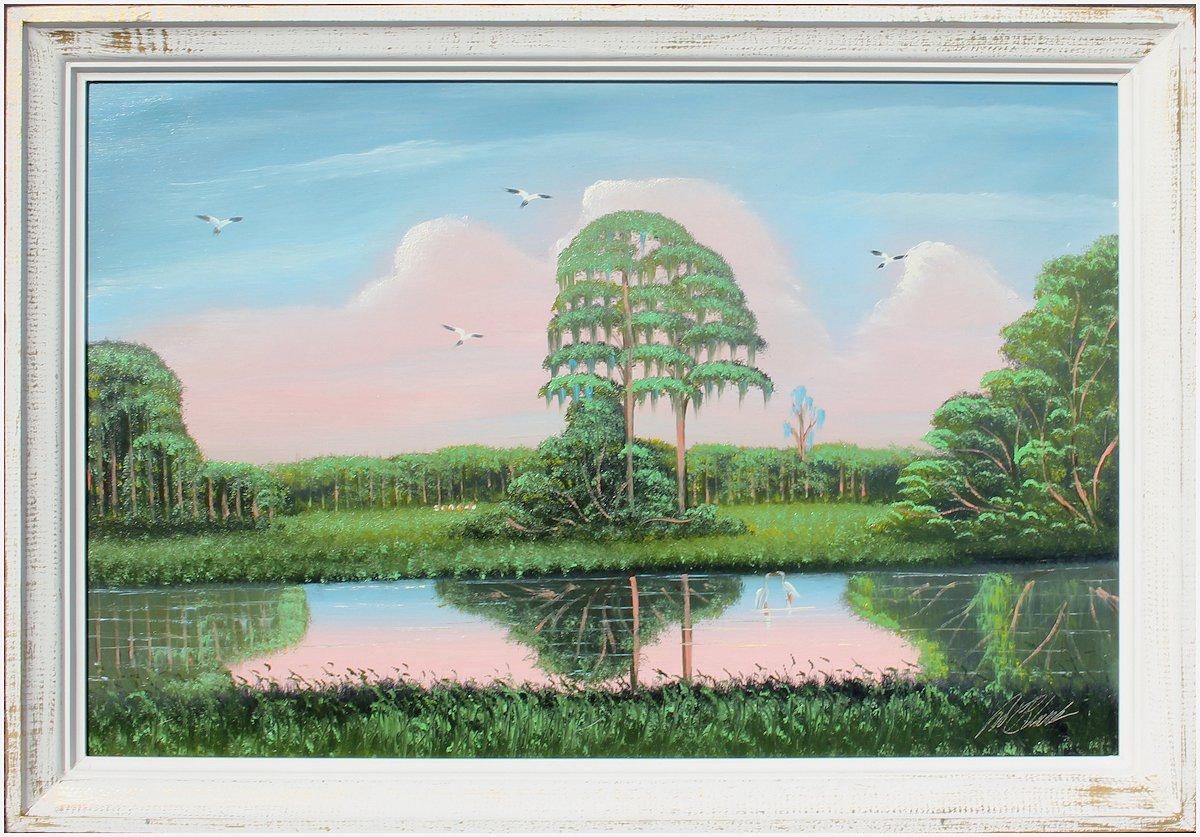 BLACK, Al, (American, 20th Century): Florida Highwaymen backwaters scene with stand of cypress trees, birds in flight, and pink clouds, Oil/Masonite, signed lower right, 24'' x 36'', framed 29 1/2'' x 37 1/2''.