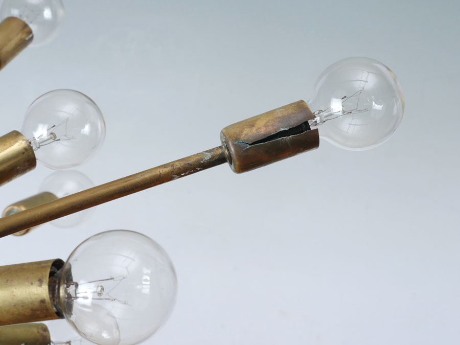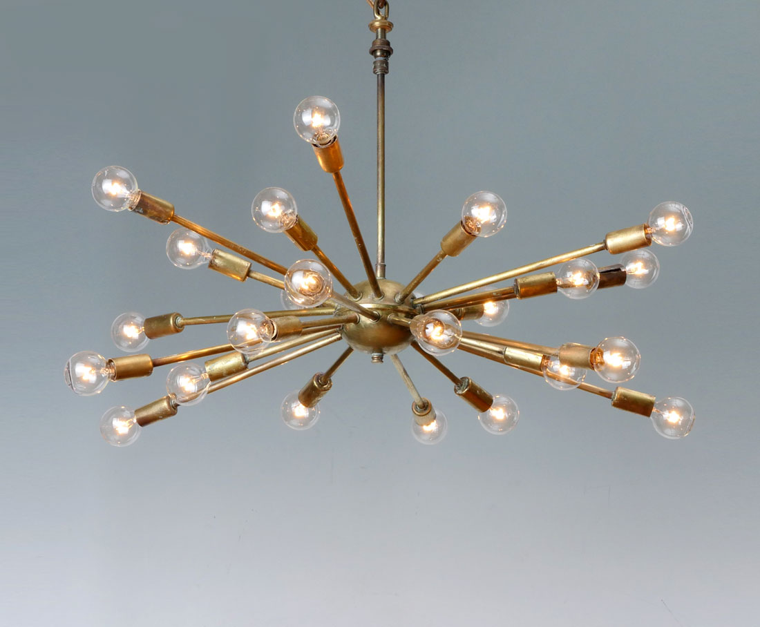 STILNOVO STYLE BRASS 24 ARM SPUTNIK CHANDELIER: In the manner of Stilnovo, mid century brass frame and arms, approx. 18'' h x 26 1/2'' dia at widest point.