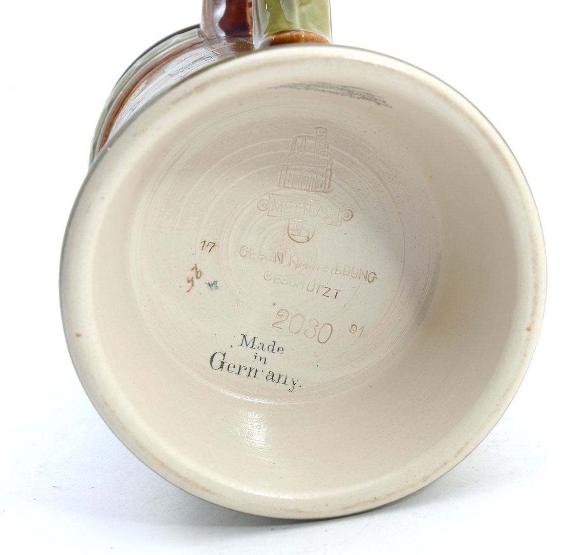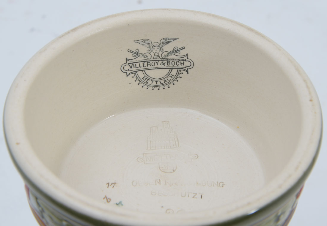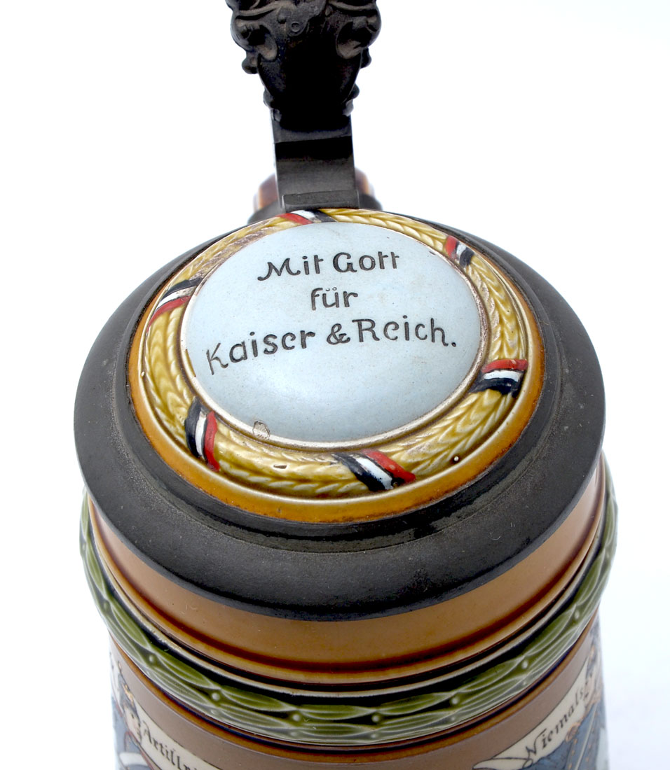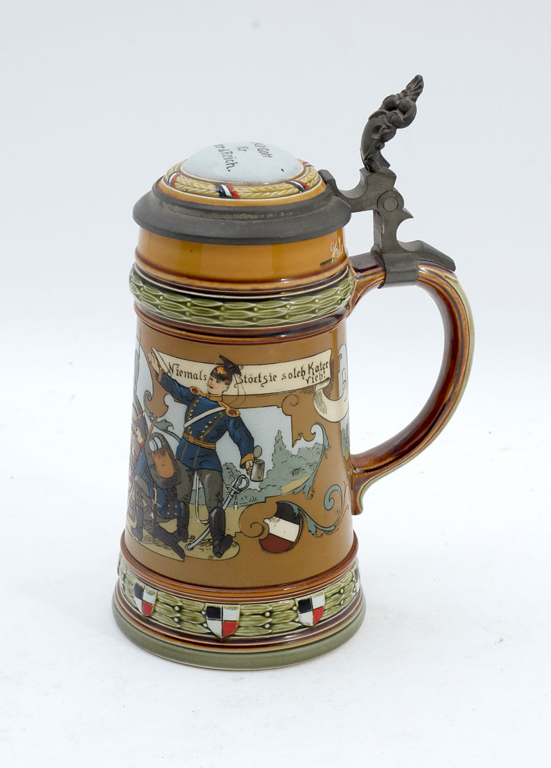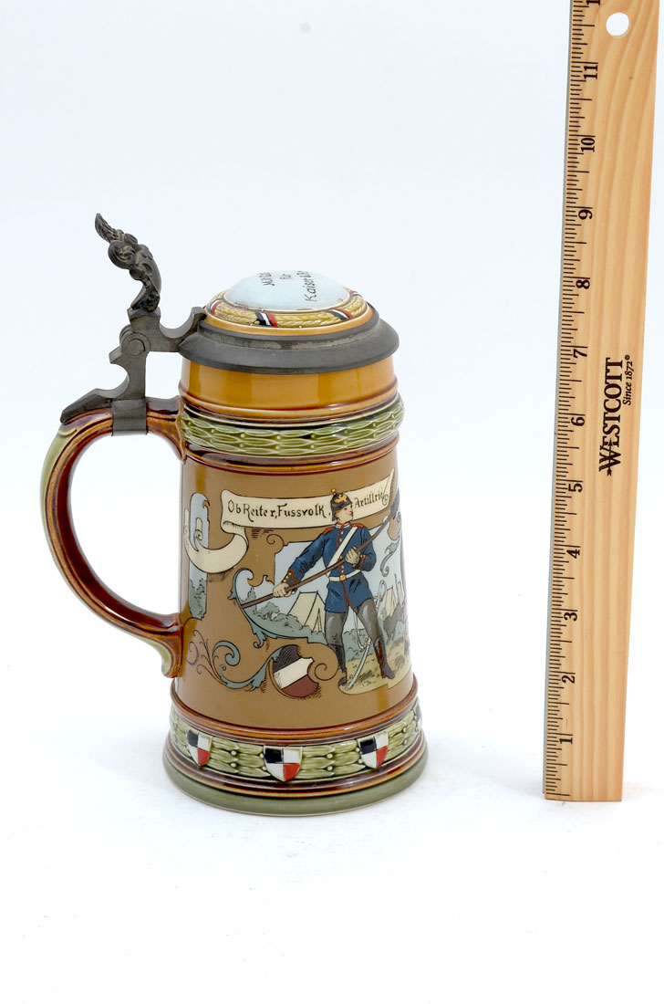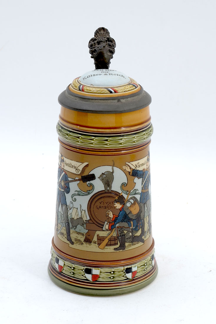 VILLEROY & BOCH METTLACH MILITARY STEIN #2030: Scene of military soldiers drinking beer from a keg, pewter lid with porcelain insert, 1/2 liter, well marked, 8 3/4'' h. x 5 3/4''.