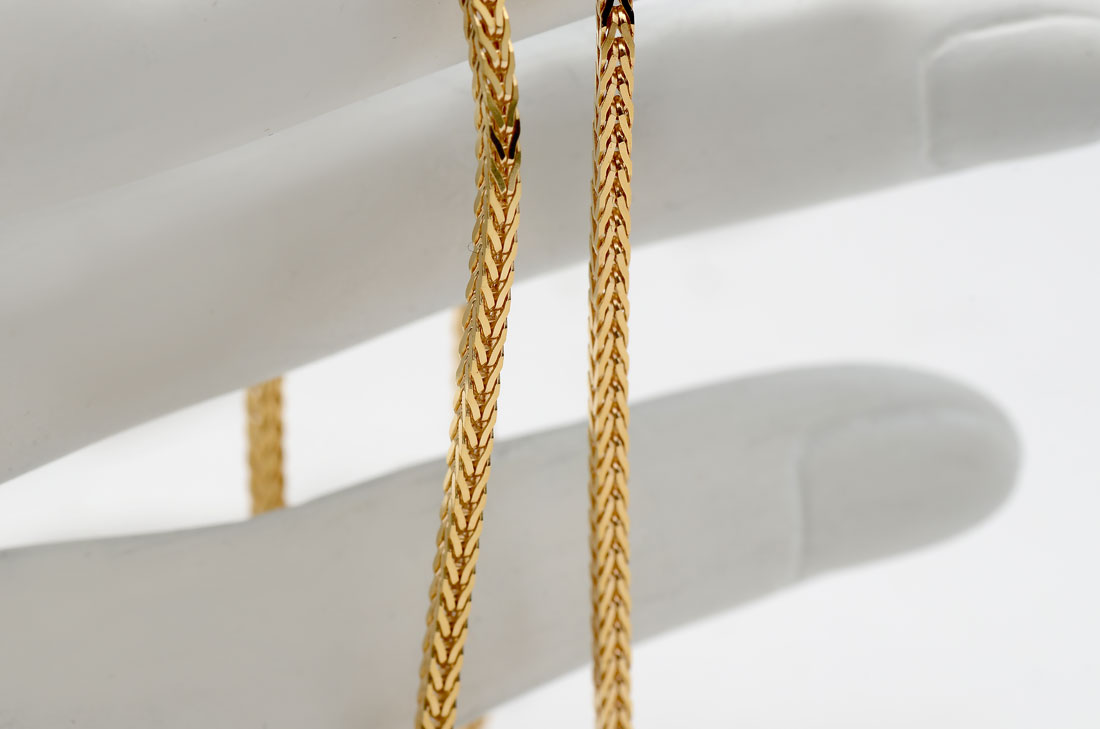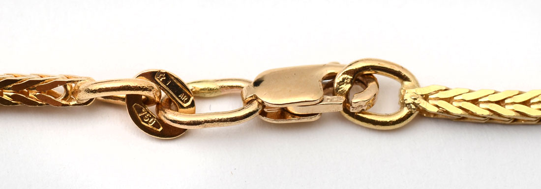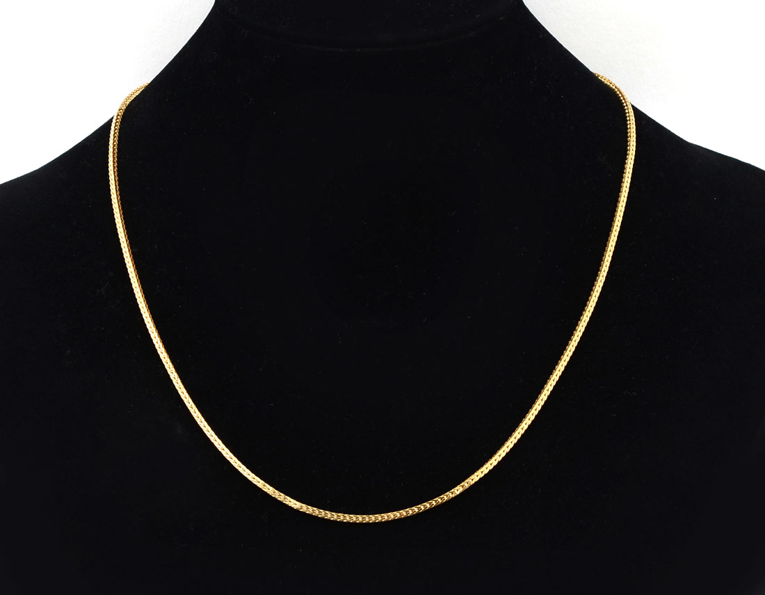 18K SQUARE FOXTAIL CHAIN: Created by an Italian maker, marked and signed, this yellow gold chain is substantial by design and pairs perfectly with lot 1210, the 18K diamond cross. 20'' chain weighs approx 11.97 grams.