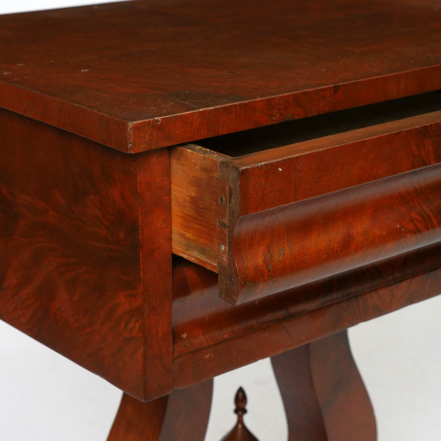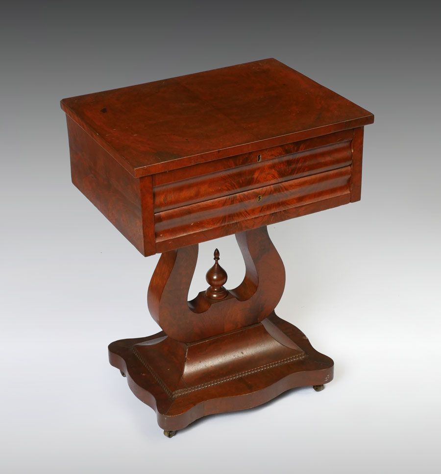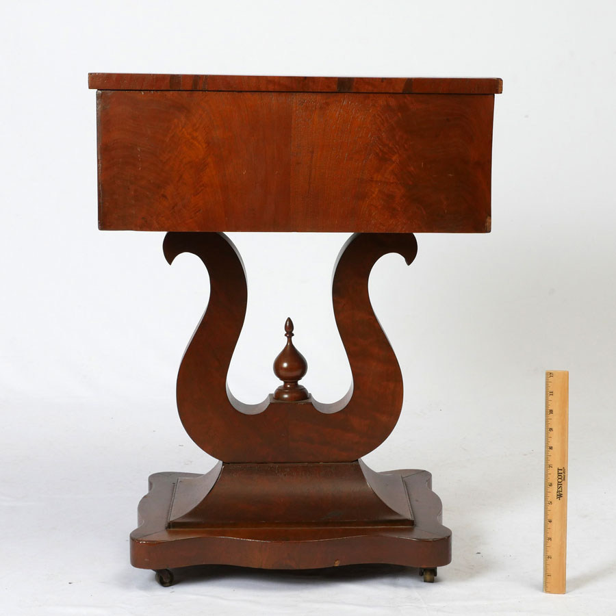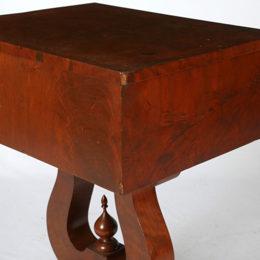 EMPIRE MAHOGANY LYRE 2 DRAWER WORK TABLE: Richly grained mahogany veneer, top with 2 serpentine front drawers, lyre center support, flared base. Overall 27 1/2'' h. x 21'' x 16 1/4''.