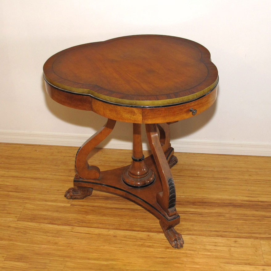 SINGLE DRAWER CLOVER TOP SHAPED SIDE TABLE: String inlaid mixed wood shaped top, single drawer. Central pillar and shaped supports, paw feet. 28 1/4'' h. x 27 1/2''.