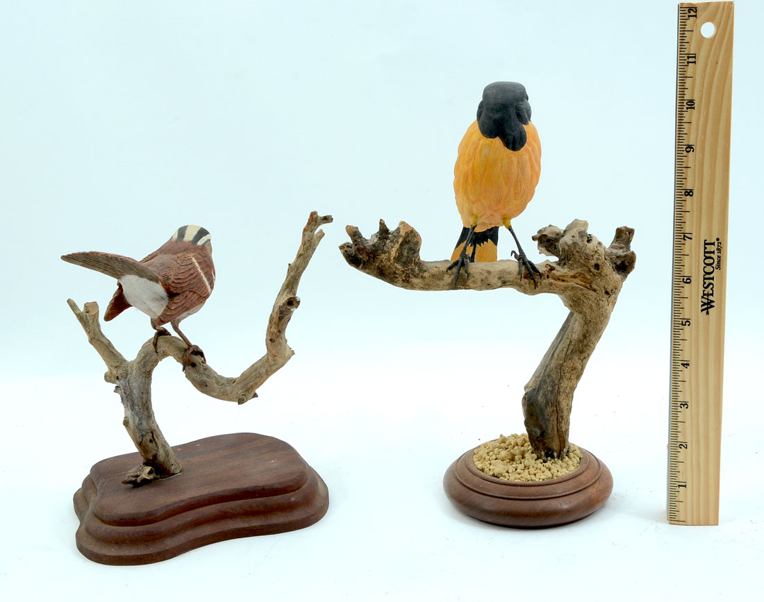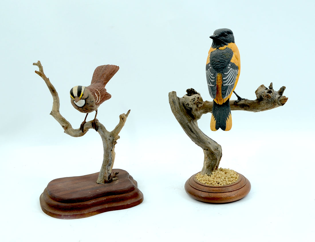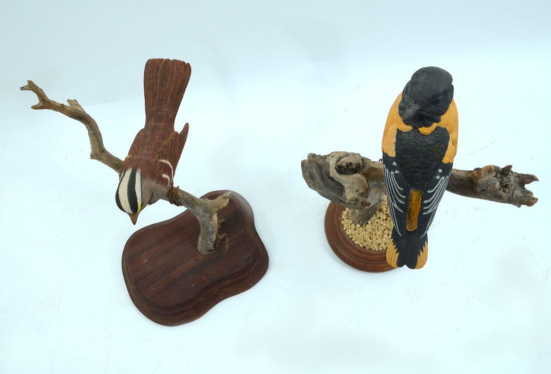 2 EXCEPTIONAL WOODEN BIRD CARVINGS: 1) Oriole 10.5 h., no visible signature; 2) White Throated Sparrow by R. Mccormick, 9'' overall, signed under the base.