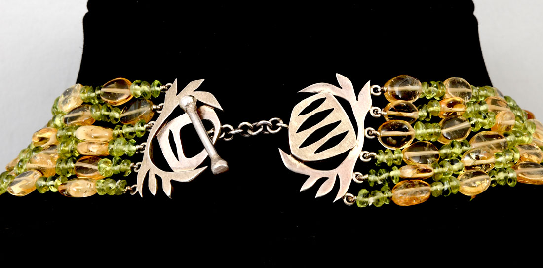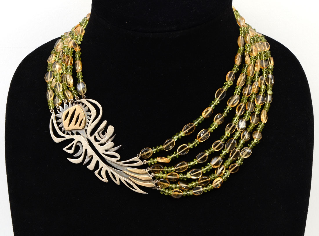 JOHN AGEE OF PARIS STERLING & 18K NECKLACE: 6 strands of green and yellow stones connect to the beautiful central free-form medallion of sterling with 18K insets. 15.5'' long. John Agee is American born and educated and lives in Paris.