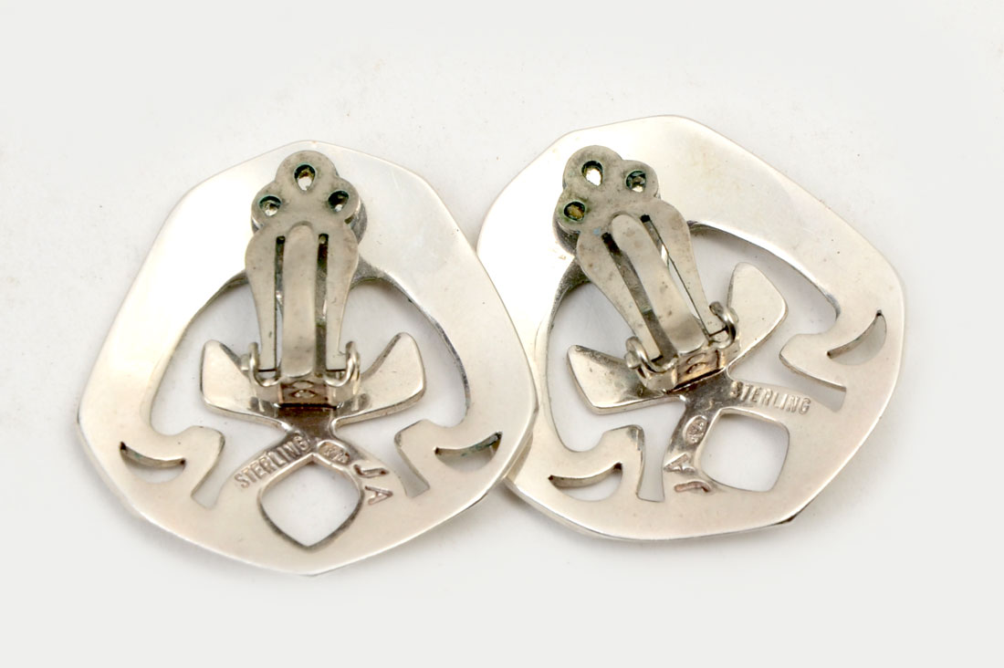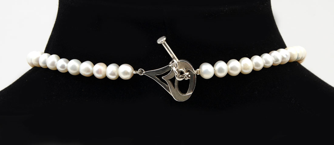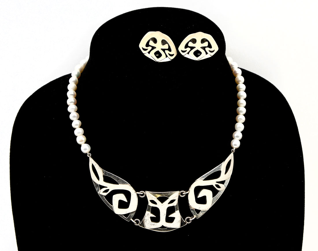 JOHN AGEE STERLING & PEARLS NECKLACE AND EARRINGS: A single strand of pearls connects to a 5'' sterling creation with matching earrings. 15.5'' long. Marked J.A. 925. John Agee is American born and educated and lives in Paris.