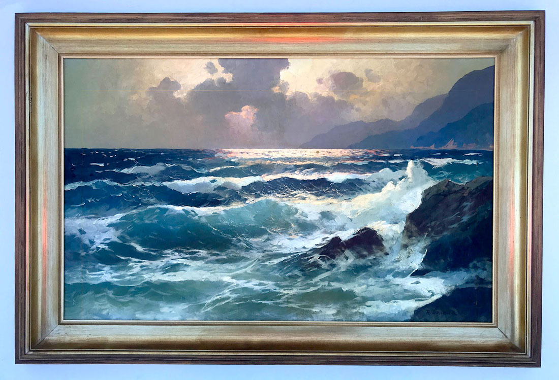 DZIGURSKI, Alexander (American, 1911-1995): Coastal Sunset, Oil/Canvas, 26'' x 42'', signed lower right, framed, 33'' x 50'', Newman Galleries label verso.