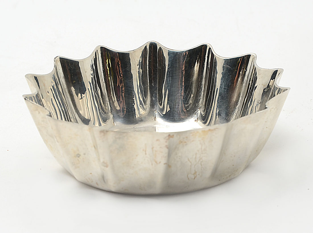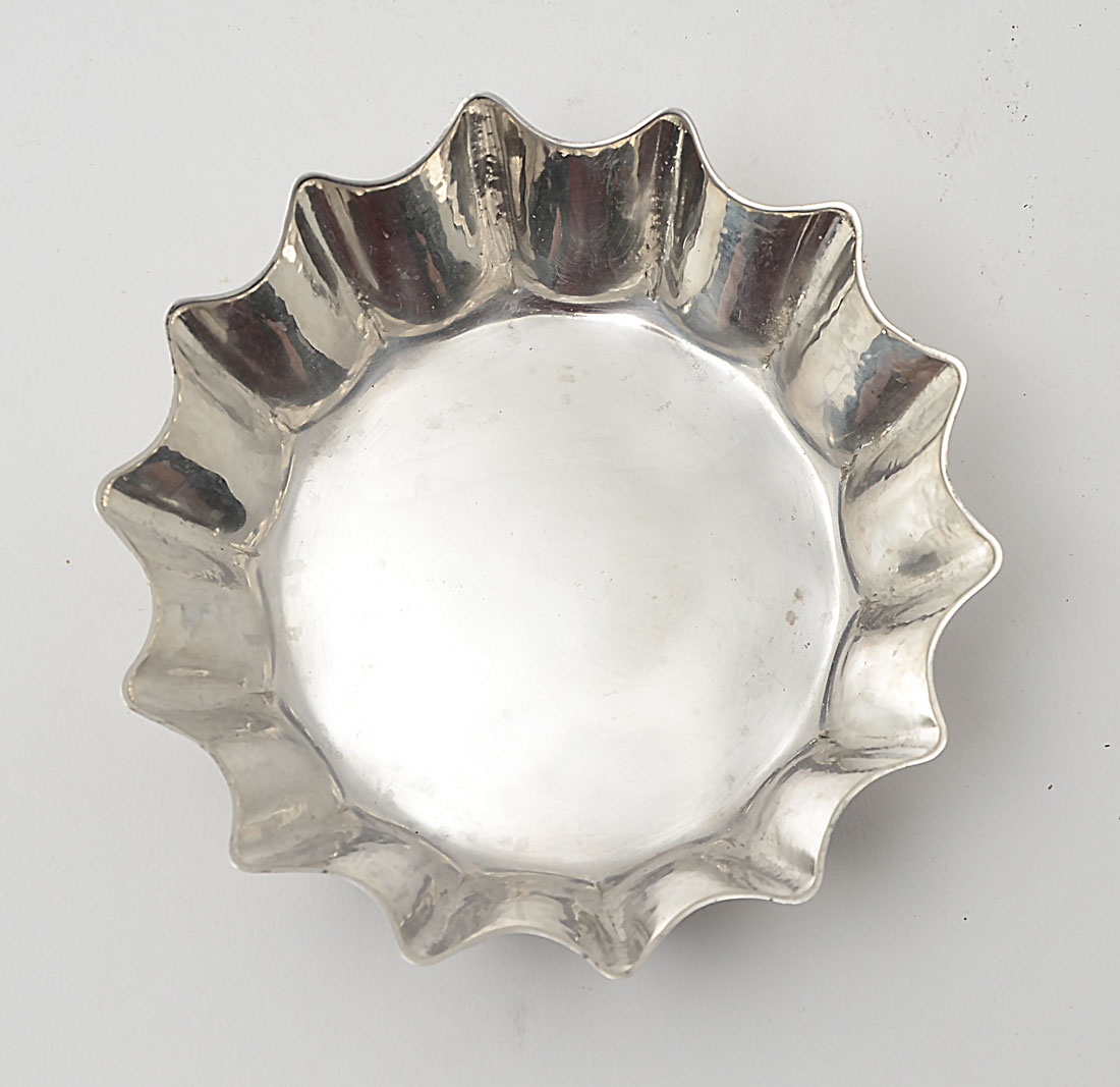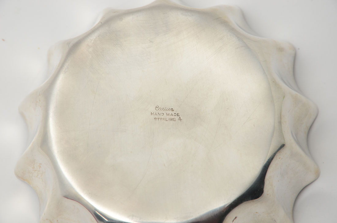 SMALL CARTIER STERLING NUT BOWL: Scalloped sides, marked on base ''Cartier, Hand Made, Sterling 4''. Measures 1 1/2'' h. x 4 1/2'' dia. Approx. 4.9 troy oz.