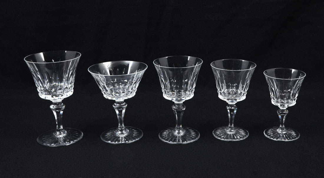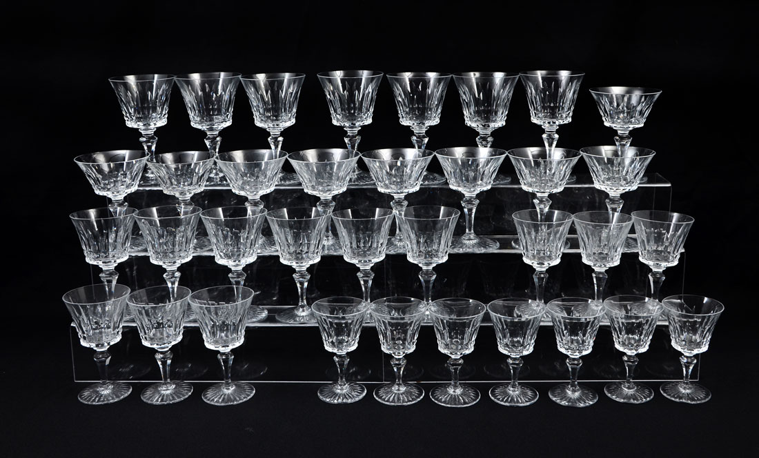 BACCARAT BUCKINGHAM CRYSTAL STEMWARE: Approx. 35 pieces in the Buckingham pattern by Baccarat to include 7 water goblets (6''), 6 claret wine (5 3/8''), 6 port wine (5''), 9 sherbet / champagne (5''), 7 sherry glasses (4 1/2'').