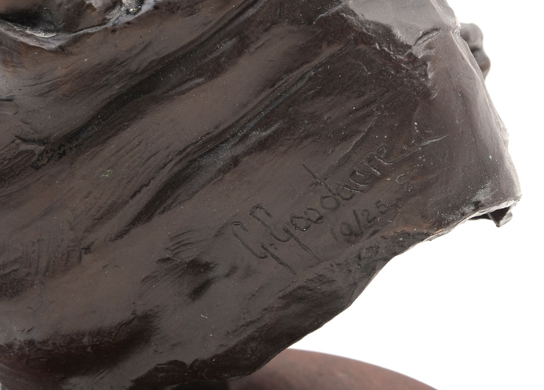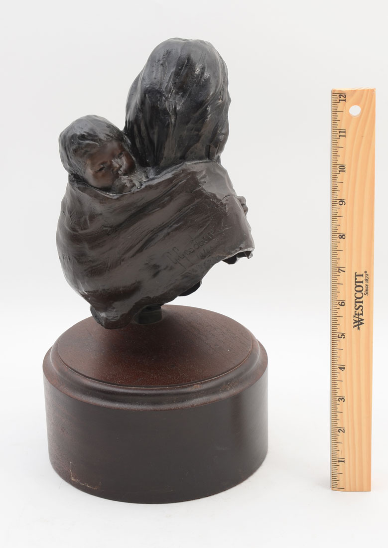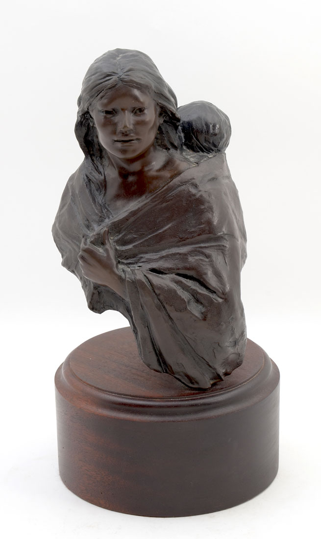 GOODACRE, Glenna, (American, 1939- ): ''Indian Mother with her Child on her Back'', Bronze, 9.50'' in height, signed and numbered 10 of 25, affixed to a cylindrical wooden plinth, 13'' overall in height.