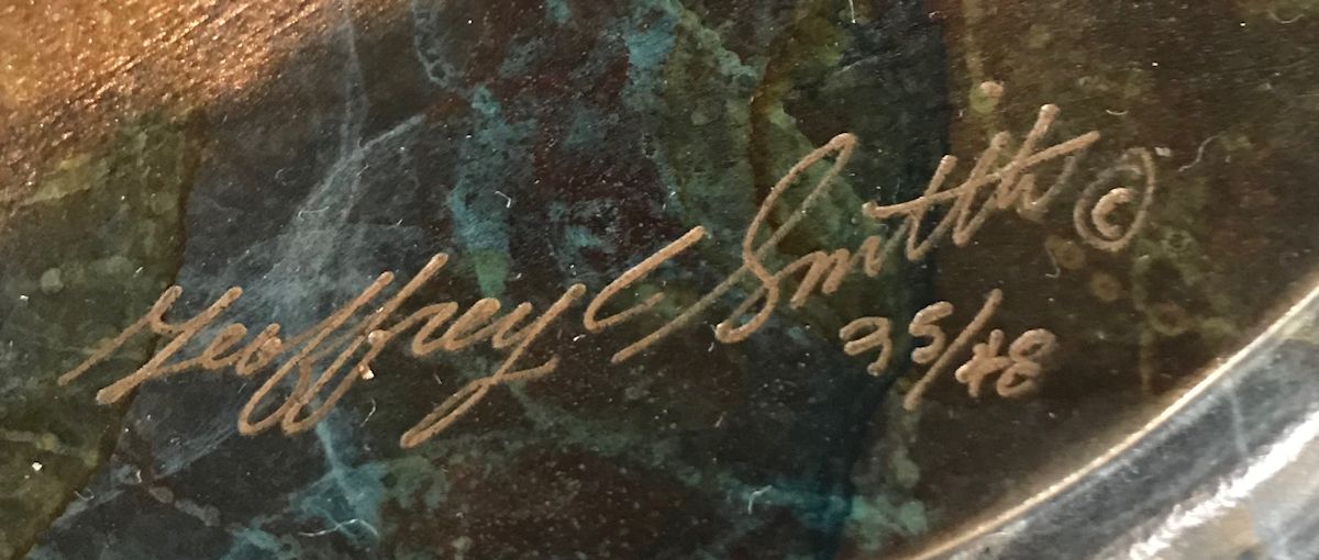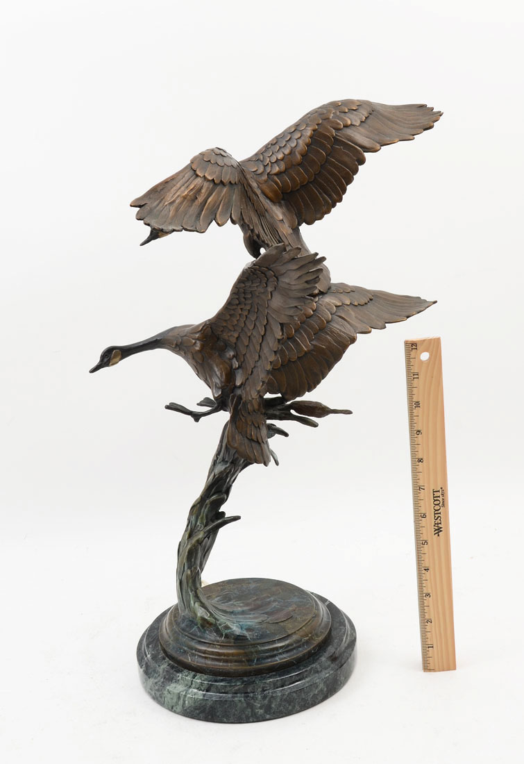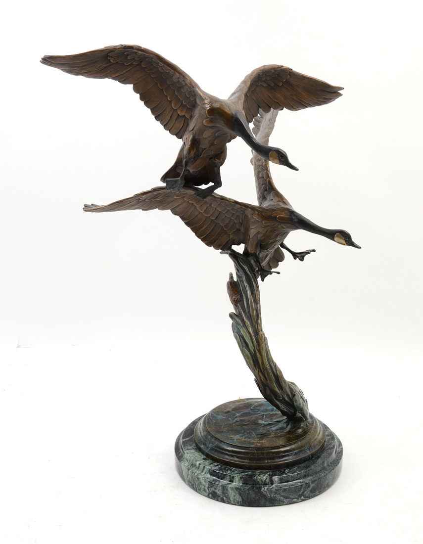 SMITH, Geoffrey, (American, 20th/21st C.): Geese in Flight, Bronze with Patina, 18.5'' h., signed and numbered 35/48 on the base, beveled marble plinth, approx 17.5 lbs.
