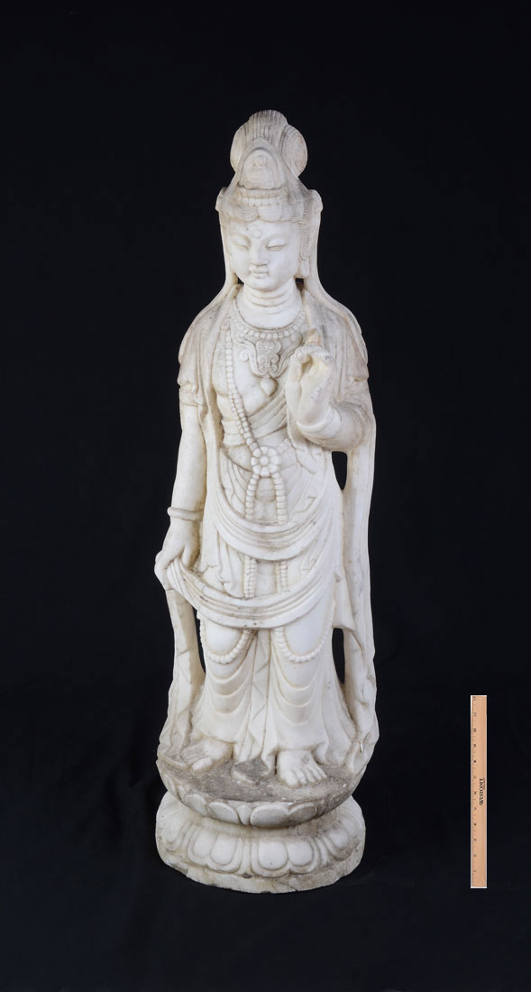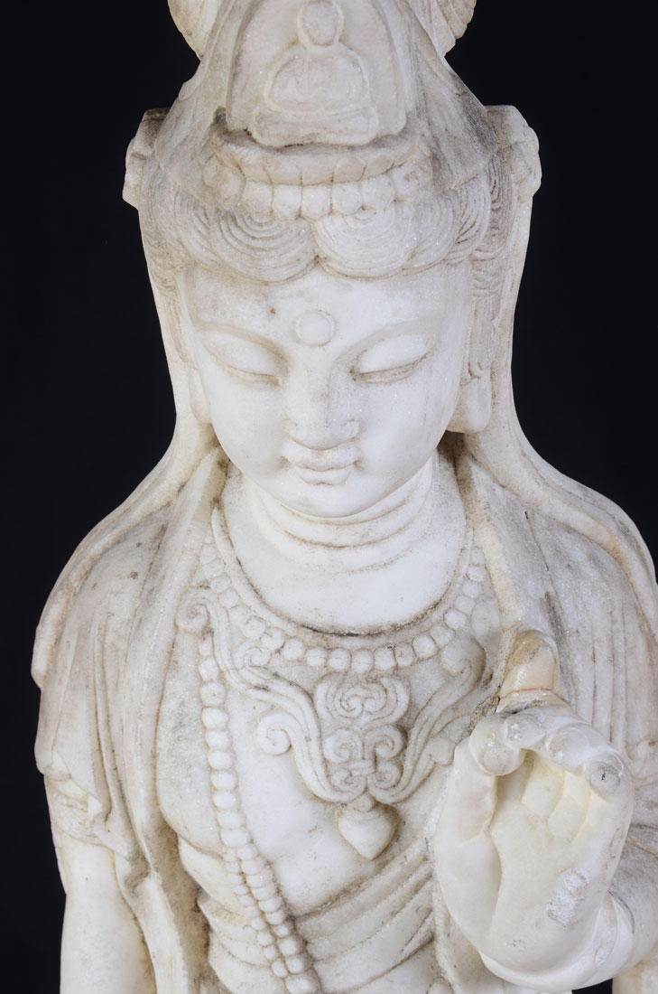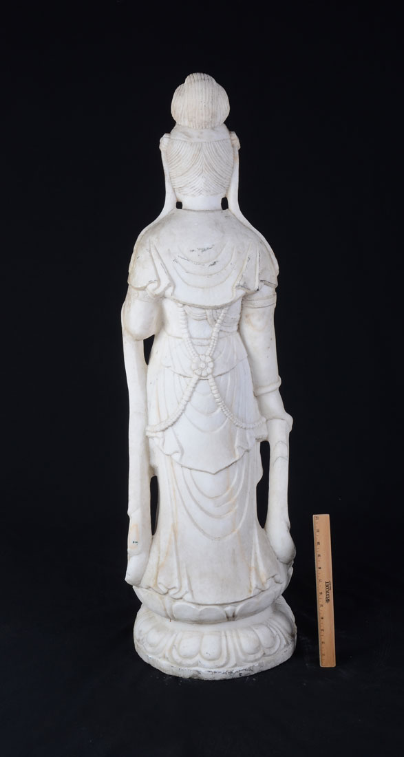 MARBLE FIGURAL GUANYIN SCULPTURE: Figure of a standing Guanyin on lotus, overall 43 1/4'' h. x 13'' x 13''.