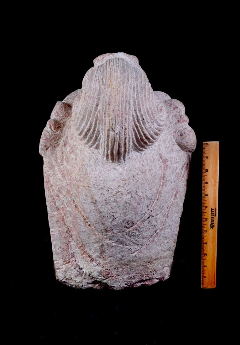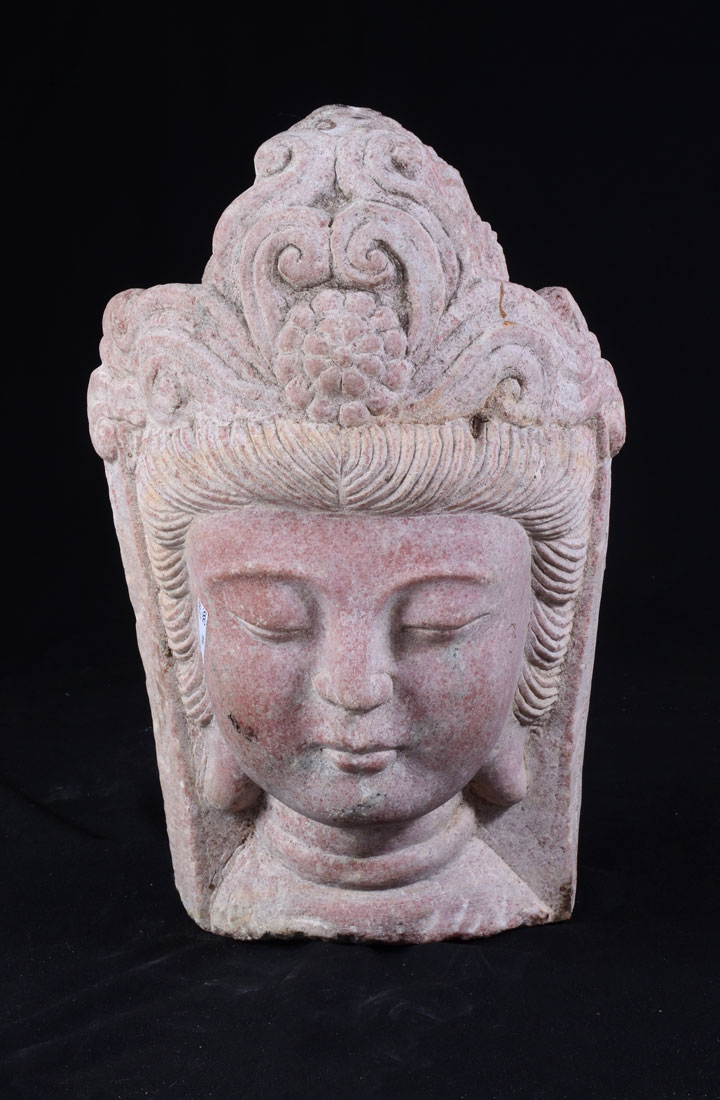 PINK MARBLE BUST OF GUANYIN: Variegated pink marble bust of Guanyin, overall measures 19'' x 11'' x 9 1/2''.