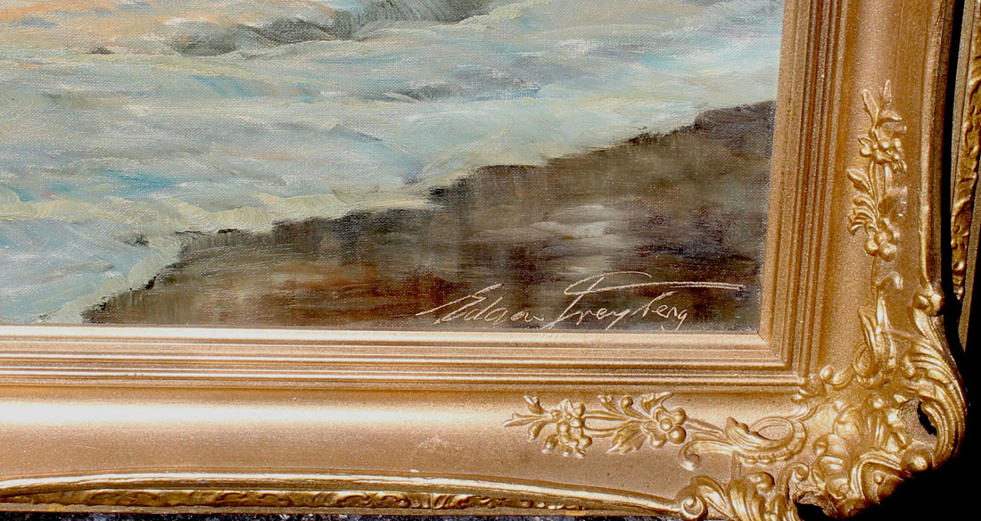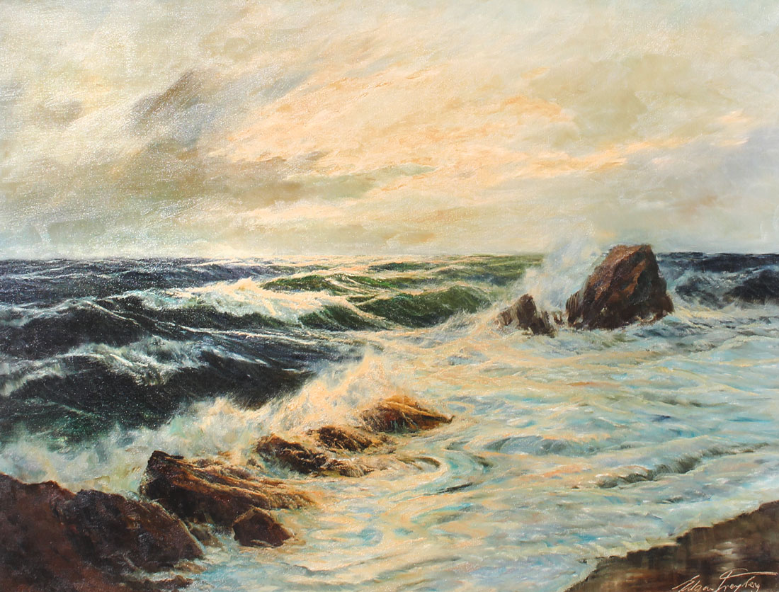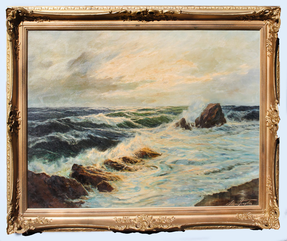 FREYBERG, Edgar, (German, 1927-): ''Crashing Surf, Coastal Rocks Painting'', Oil/Canvas, 23.75'' x 35.50'', signed lower right, pierced carved frame is 29.25'' x 41.25''.