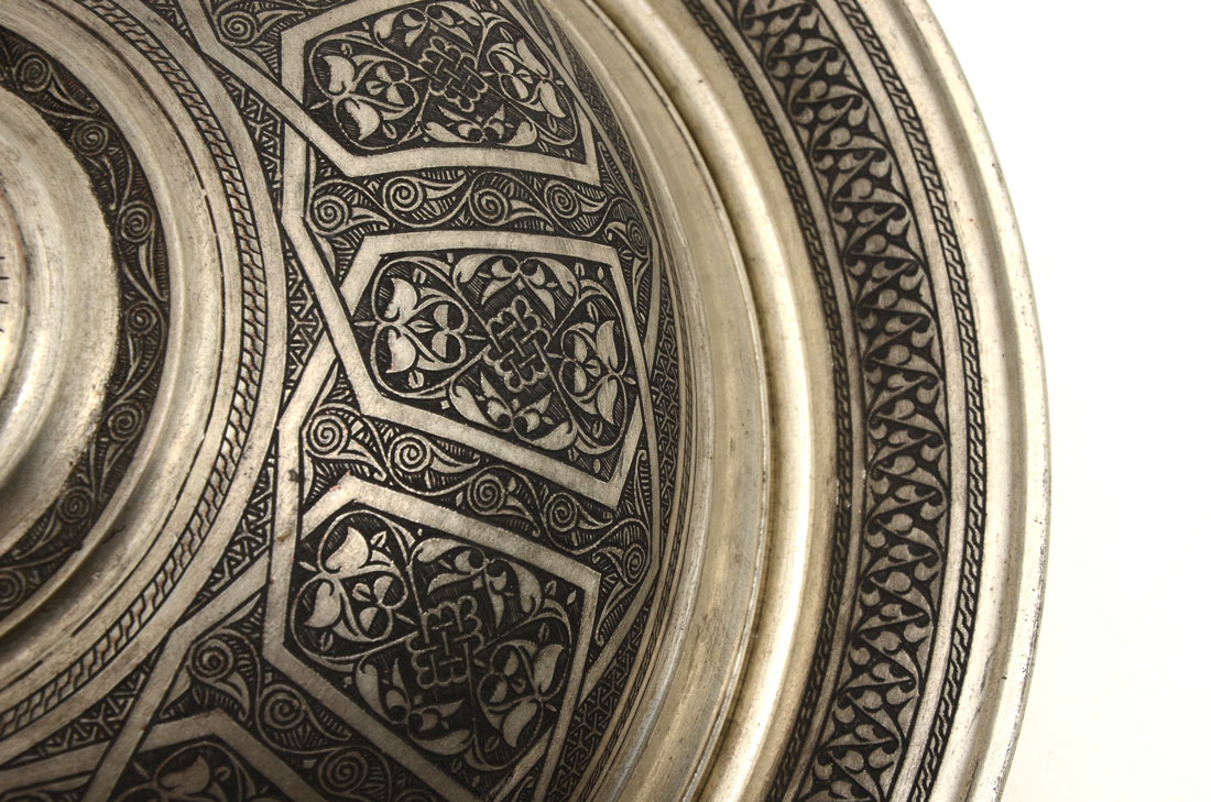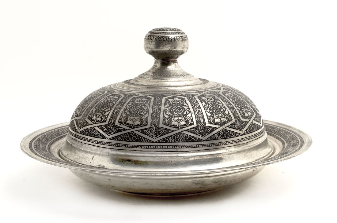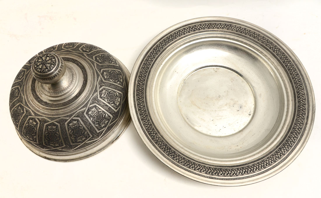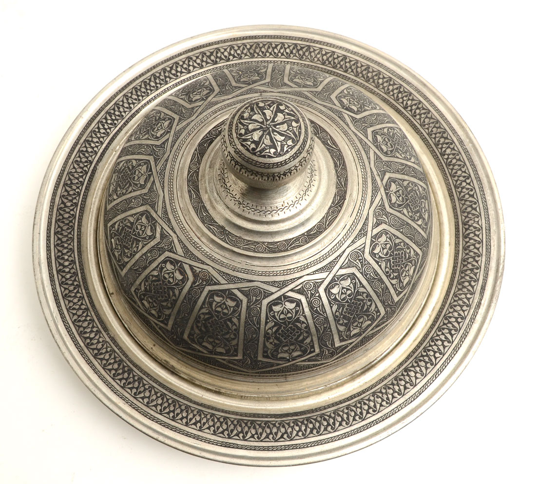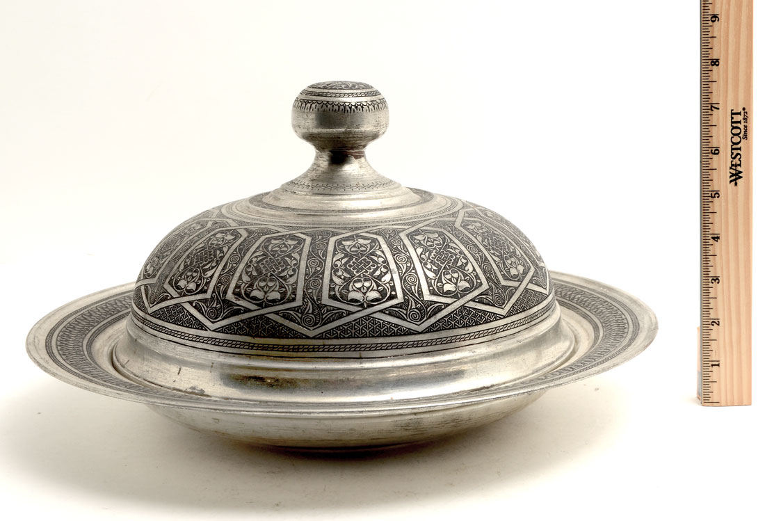 PERSIAN DAMASCENE SILVERED COVERED TRAY: Serving tray with domed lid, damascene decoration all over, silvered metal, overall 8'' h. x 14 3/4'' dia.