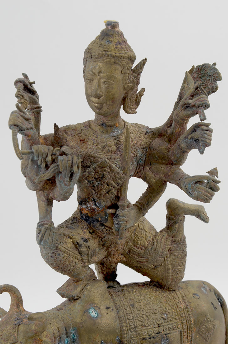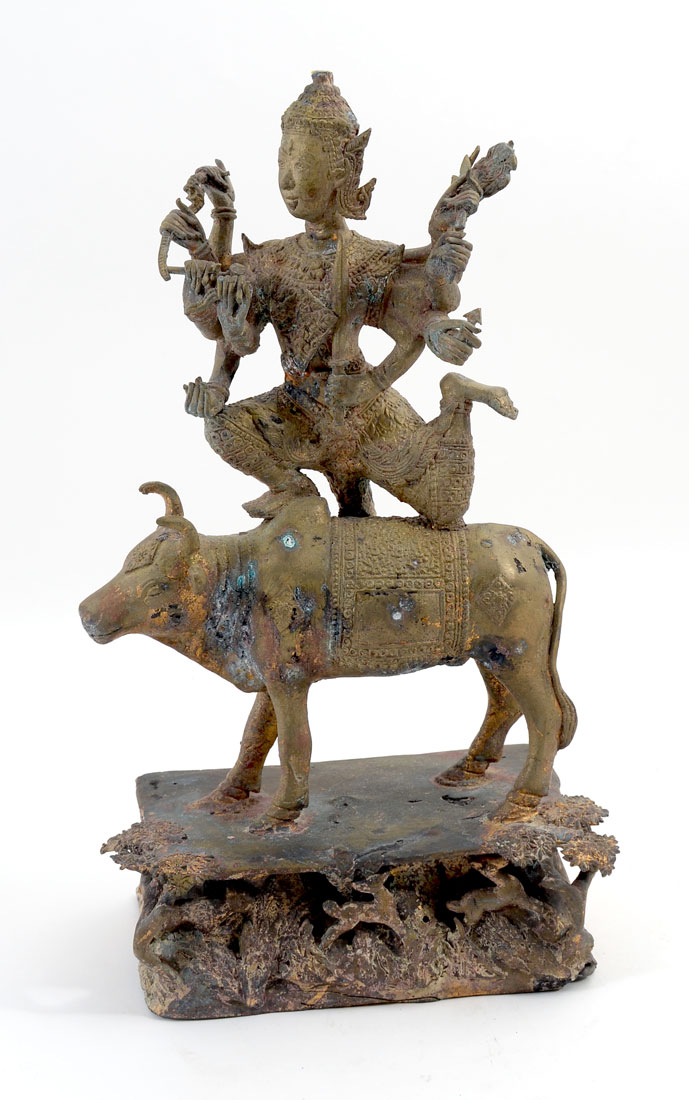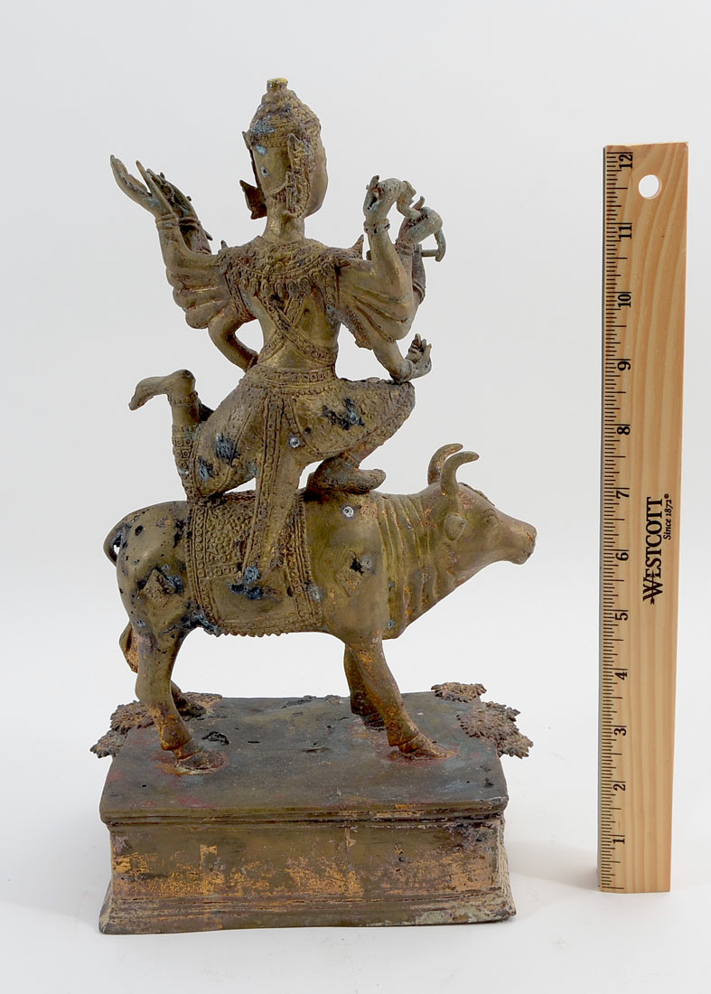 THAI CAST BRASS FIGURE OF DURGA ATOP A BUFFALO: Cast white brass figure of a Durga riding atop a bull, gilt accents, 13 1/4'' h. x 7 3/4''.