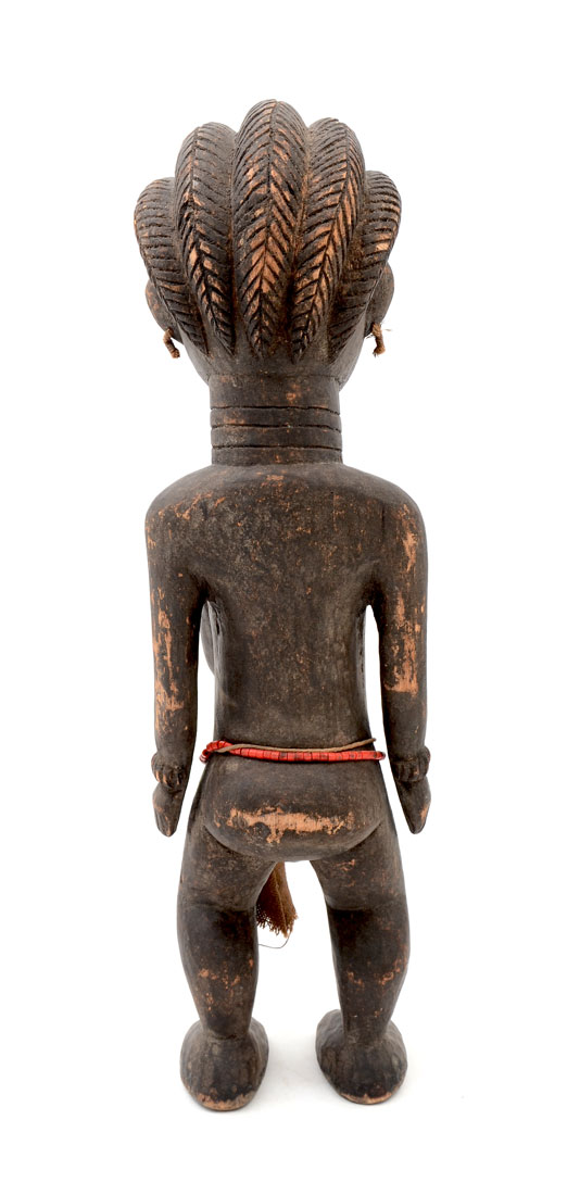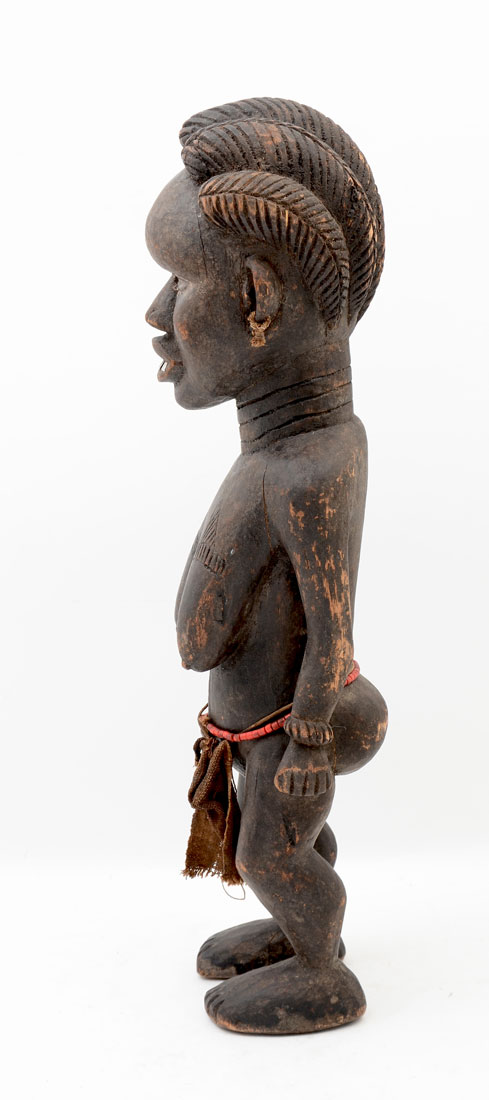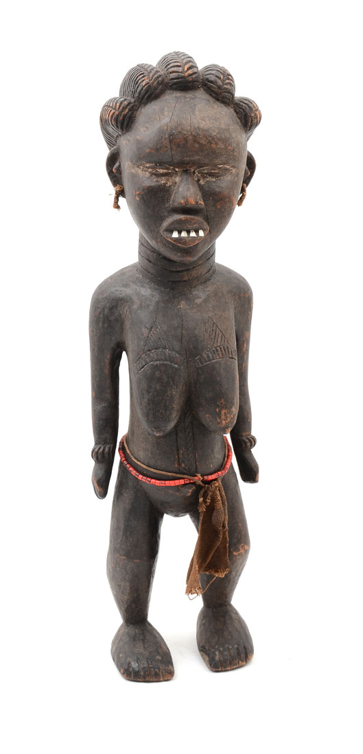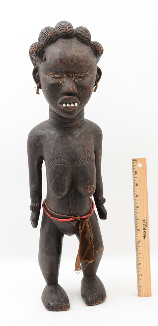 WEST AFRICAN DAN PEOPLES CARVED WOMAN FIGURE: Carved wood female figure with metal teeth, loin cloth and bead belt, Dan peoples, Liberia/Ivory Coast, 23 1/2''. 19th/20th Century.