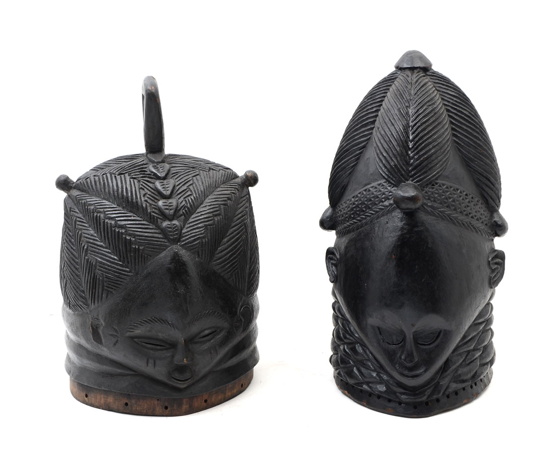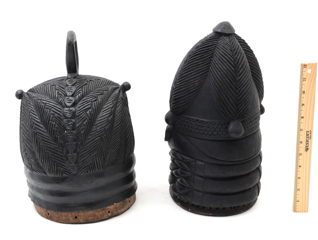 2 WEST AFRICAN MENDE CARVED HELMET MASKS: 2 pieces total, carved wood with black finish, Mende culture, Sierra Leone, tallest 18'' h. 20th Century.