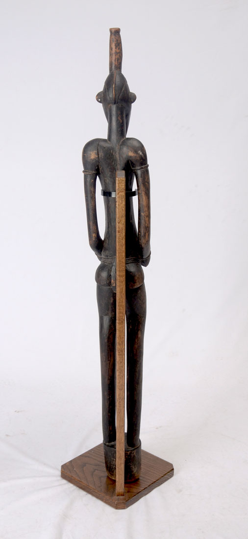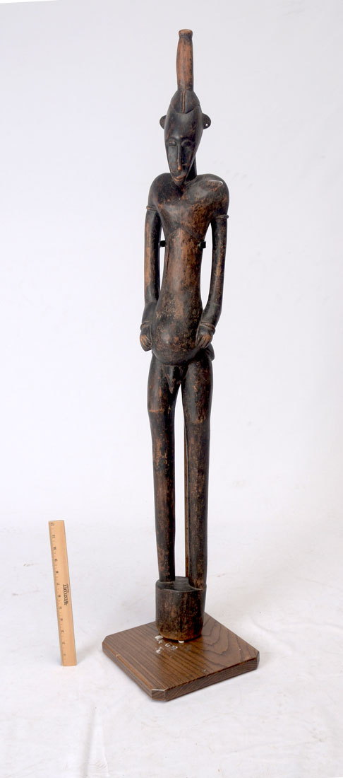 WEST AFRICAN SENUFO CARVED FIGURAL RHYTHM POUNDER: Tall carved wood figure of a man with distended belly, Senufo culture, Ivory Coast, 46 3/4'' h. Sold with stand, 19th/20th century.