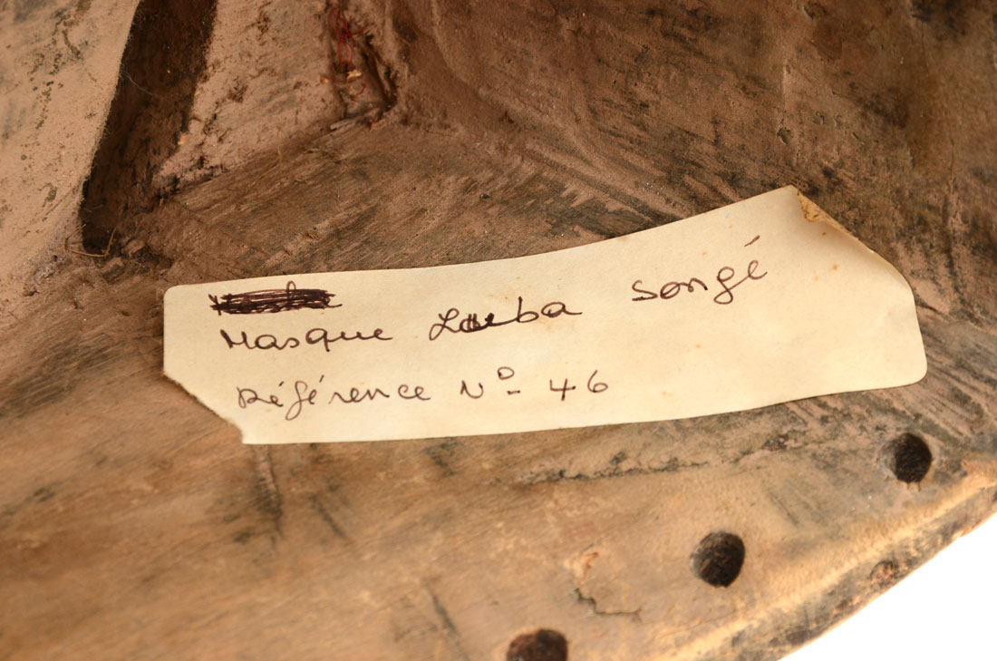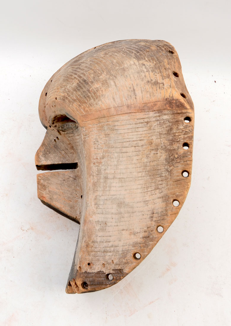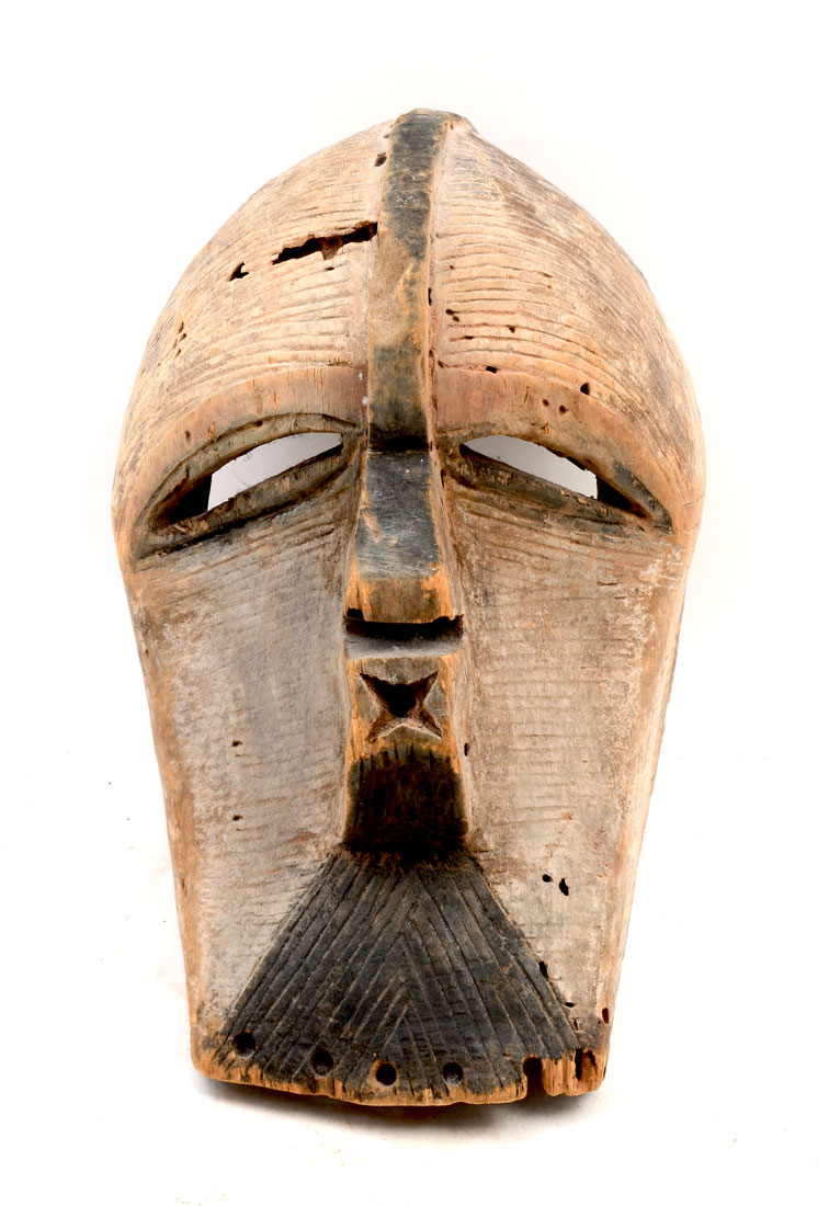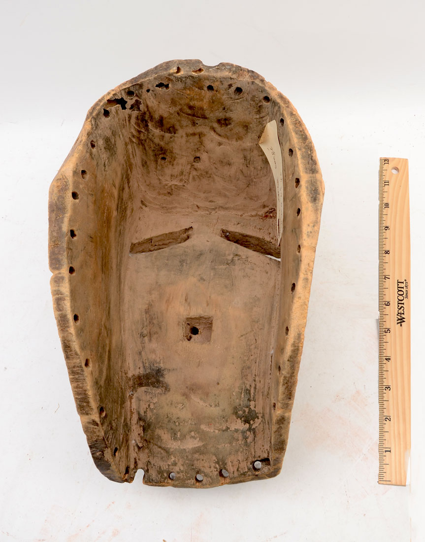 AFRICAN SONGYE KIFWEBE CARVED MASK: Carved wood light white paint decorated mask, Songye culture, Democratic Republic of Congo, 13 1/4'' x 8''. 19th/20th Century.