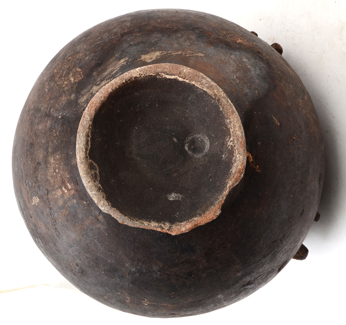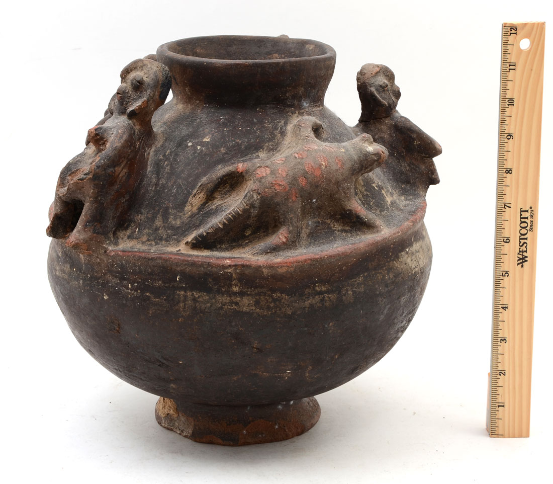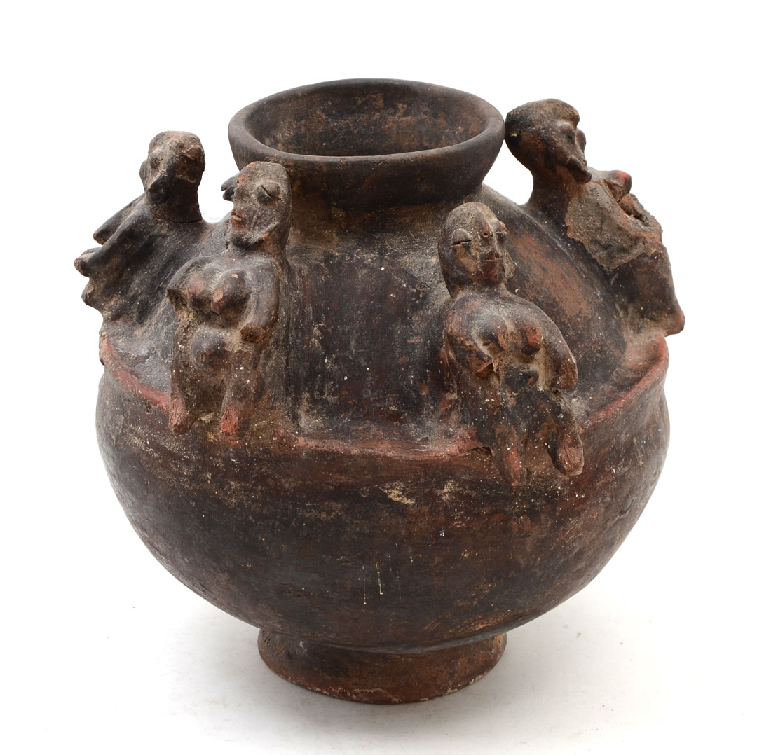 AFRICAN TERRACOTTA FIGURAL VESSEL: Terracotta or earthenware pot with 4 human figures and crocodile, possible Bamana culture, Mali, 11 1/4'' h. x 11''. 20th Century.