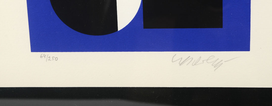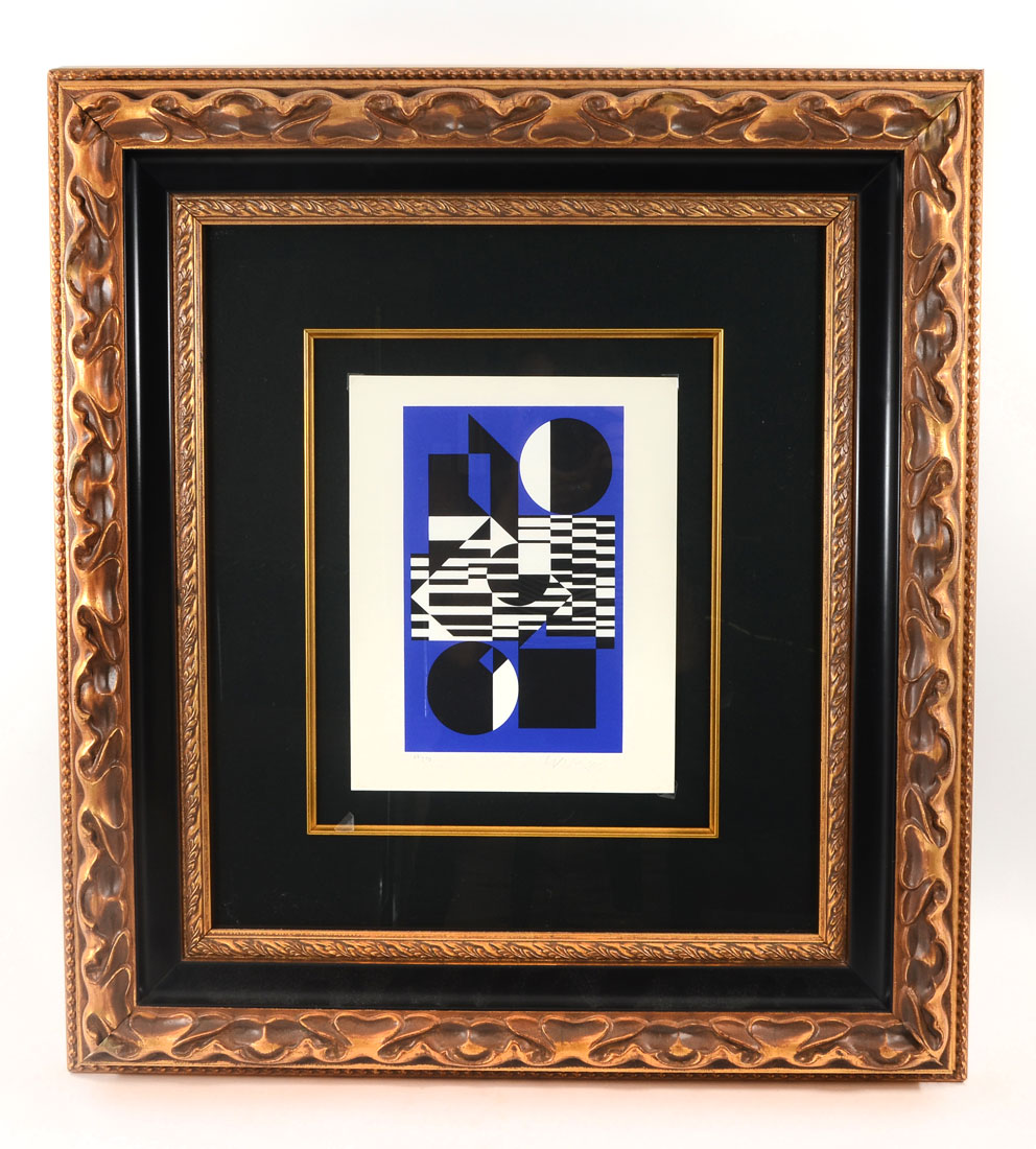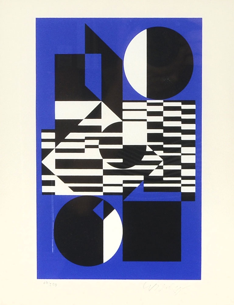 VASARELY, Victor, (Hungarian-French, 1906-1997): ''Geometric Composition in Blue, Black and White'', Serigraph, sight size is 11'' x 8.50'', signed lower right and numbered 64 of 250 lower left, custom frame is 27.50'' x 25''.