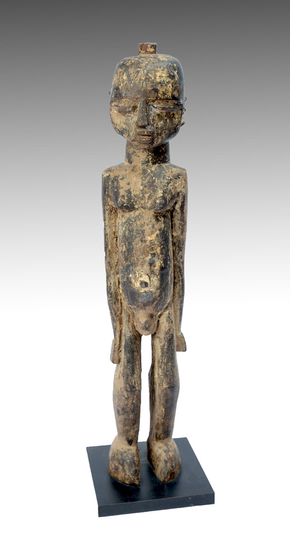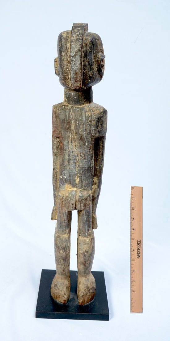 WEST AFRICAN LOBI CARVED MALE FIGURE: Carved wood figure of a man in protective stance, Lobi culture, Burkina Faso, affixed to wood base, 26 1/2'' h. 20th Century.