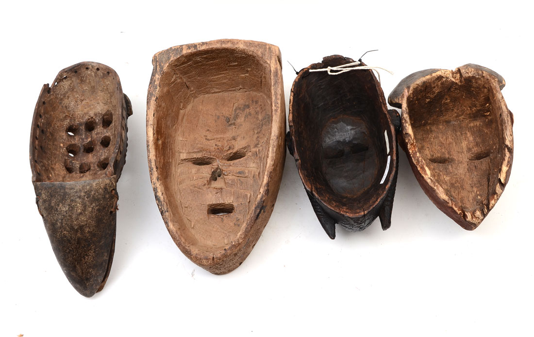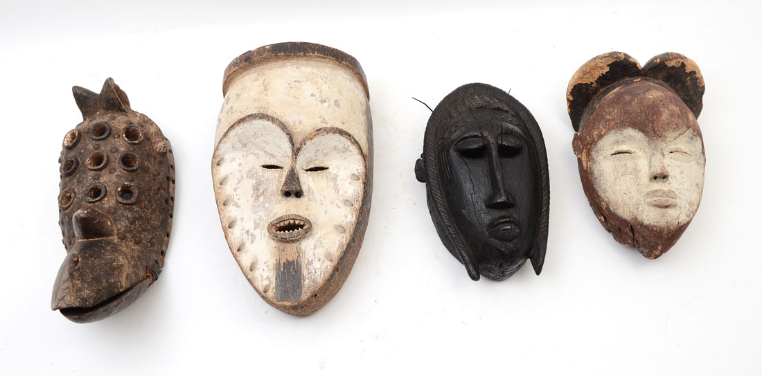 COLLECTION OF 4 CARVED AFRICAN MASKS: A collection of 4 masks total to include a Grebo Bird mask with articulating bea, Punu mask, and 2 more masks. Largest measures 14'' high.