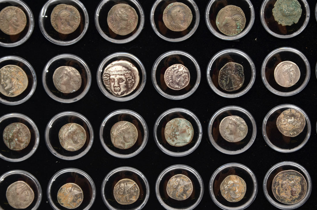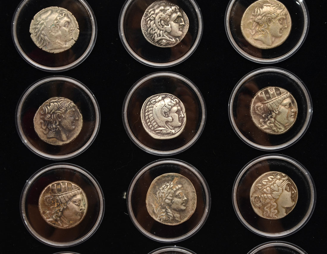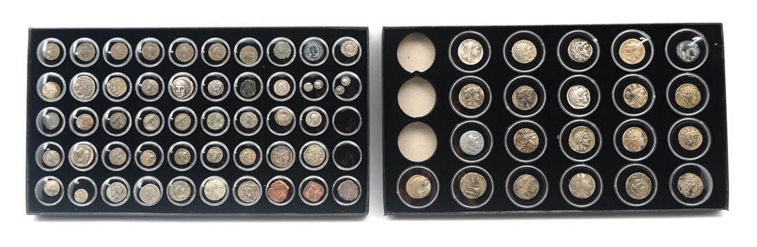 COLLECTION OF ANCIENT ROMAN & GREEK COINS: An assembled collection of ungraded ancient coins in individual plastic casing. Comes in 2 riker mounts, the first with 48 coins, the second with 21 coins.