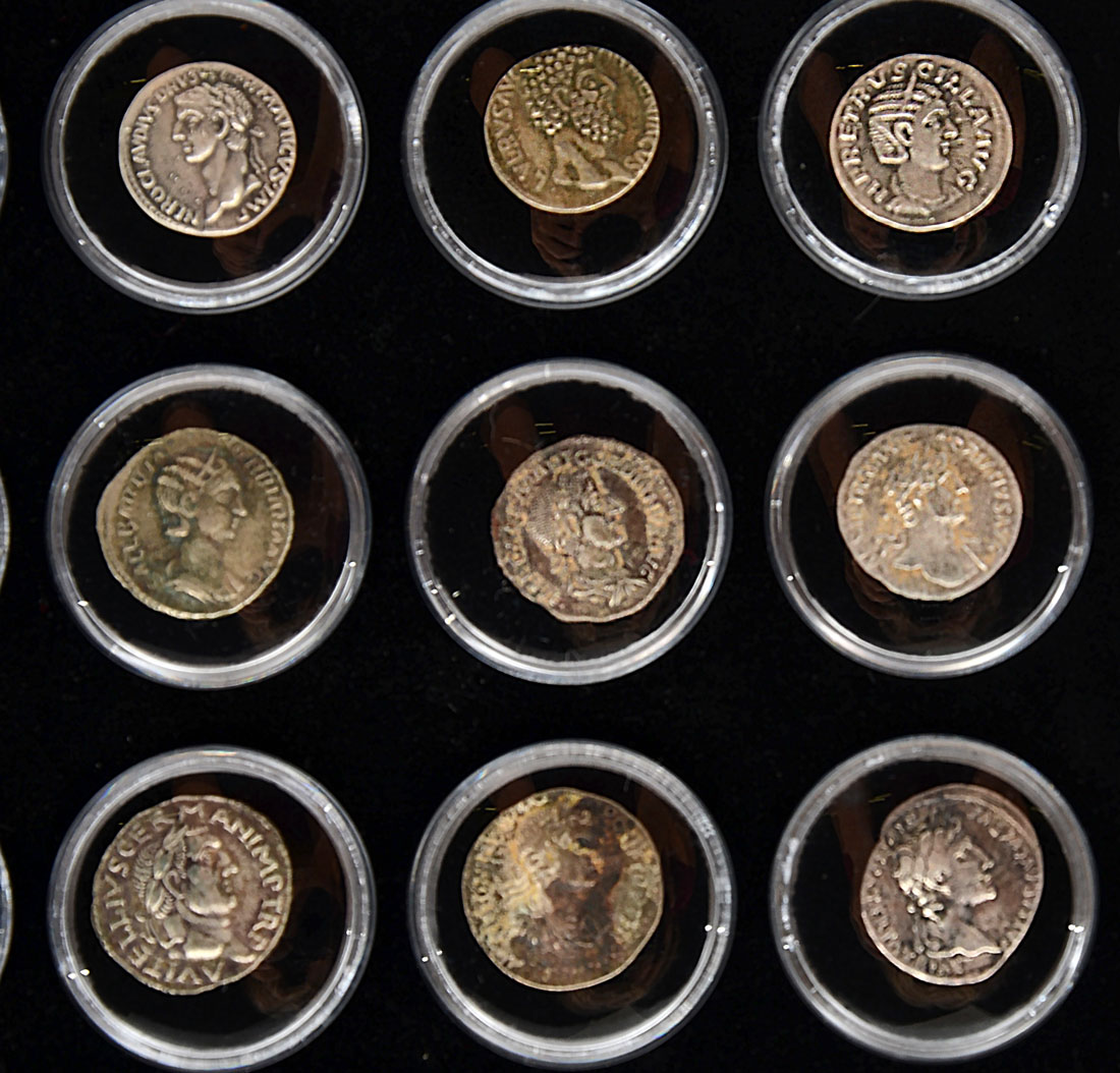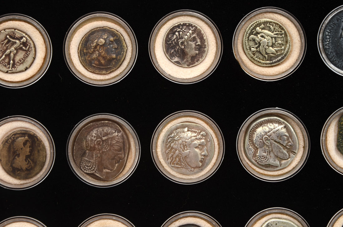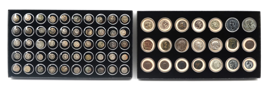 COLLECTION OF ANCIENT ROMAN & GREEK COINS: An assembled collection of ungraded ancient coins in individual plastic casing. Comes in 2 riker mounts, the first with 50 coins, the second with 21 coins.