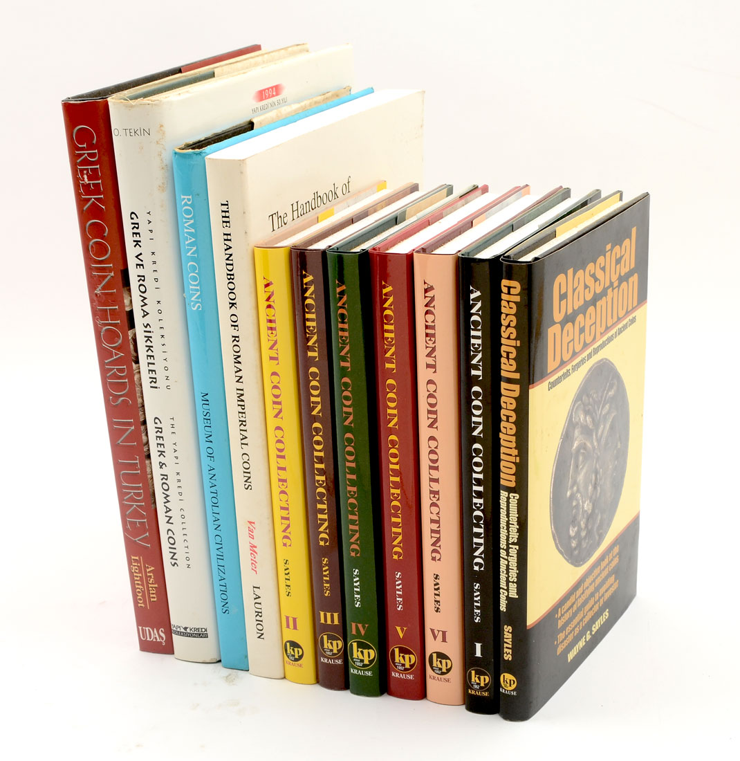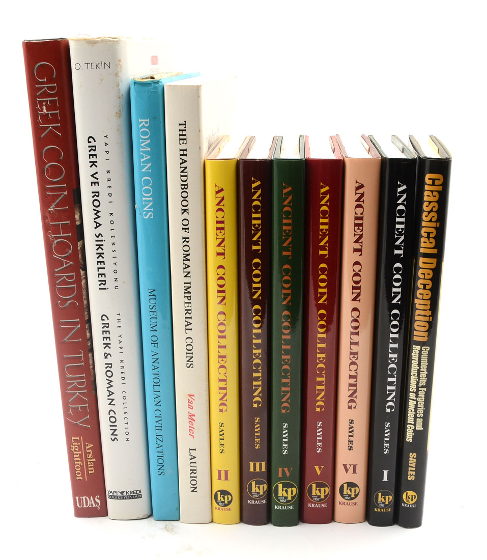 COLLECTION OF ANCIENT ROMAN & GREEK COINS AND REFERENCE BOOKS: An assembled collection of ungraded ancient coins in individual plastic casing. 1 riker mount with 46 coins and 11 ancient coin reference books.