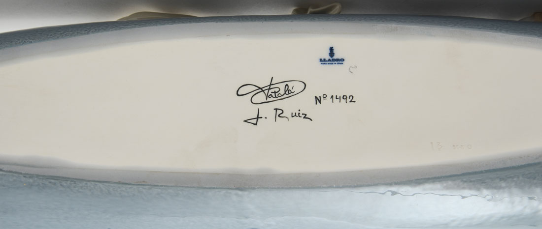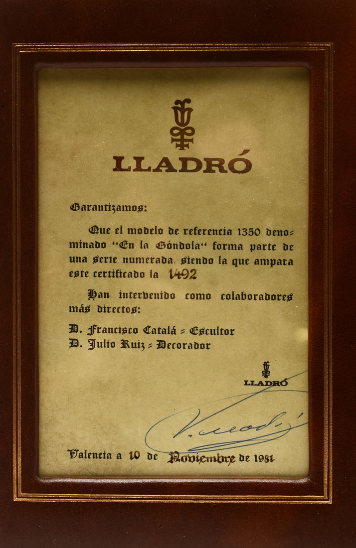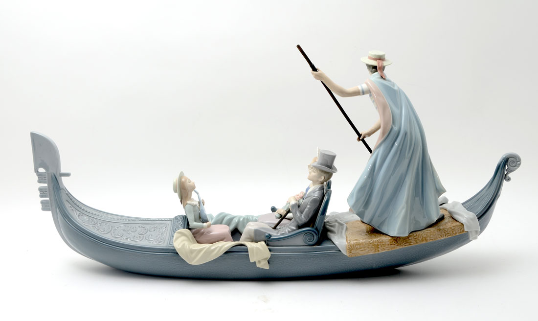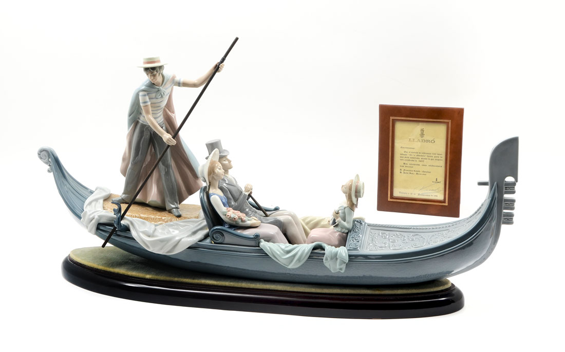 LLADRO IN THE GONDOLA 1350 PORCELAIN FIGURAL GROUP: Spanish name ''En La Gondola'', sculptor Francisco Catala, issued 1978, Limited Edition #1492, 13 1/2'' h. x 30 1/2'', sold with wood stand. CONDITION: Gondolier has been professionally re-attached.
