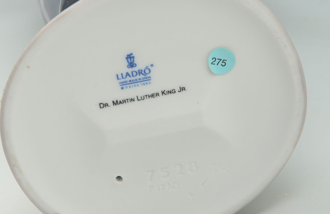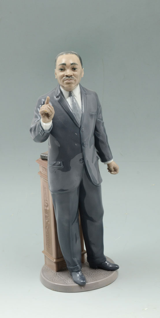 LLADRO DR. MARTIN LUTHER KING 7528 PORCELAIN FIGURINE: Spanish name the same, sculptor Salvadro Furio, retired 2004, 12 1/4'' h. Sold with original box 7 1/2'' x 17'' x 9 3/4''.