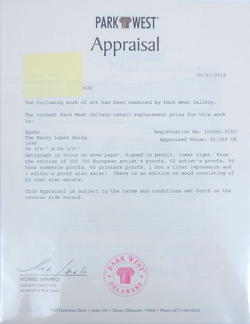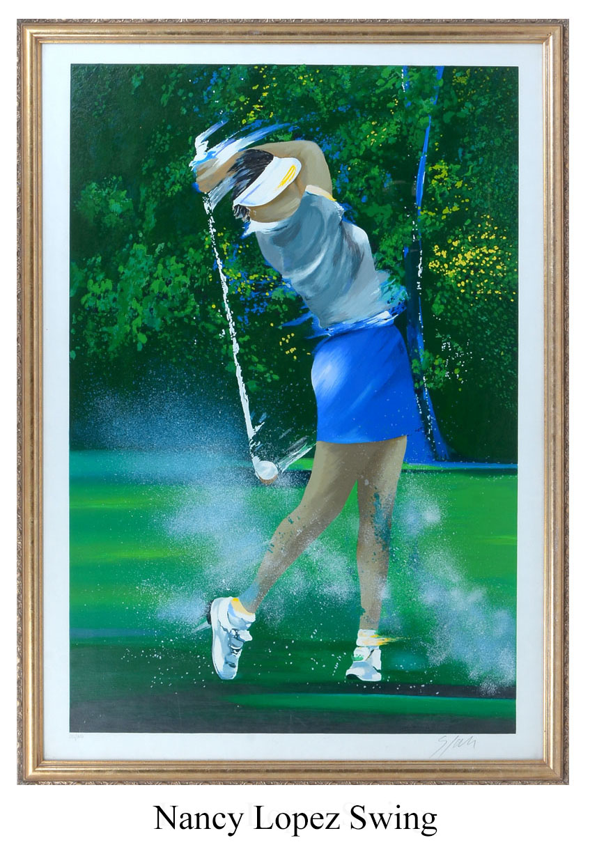 SPAHN ''NANCY LOPEZ SWING'': Serigraph in color on wove paper. Signed in pencil lower right. Measures 36.75'' x 24.5''. Sold with COA.