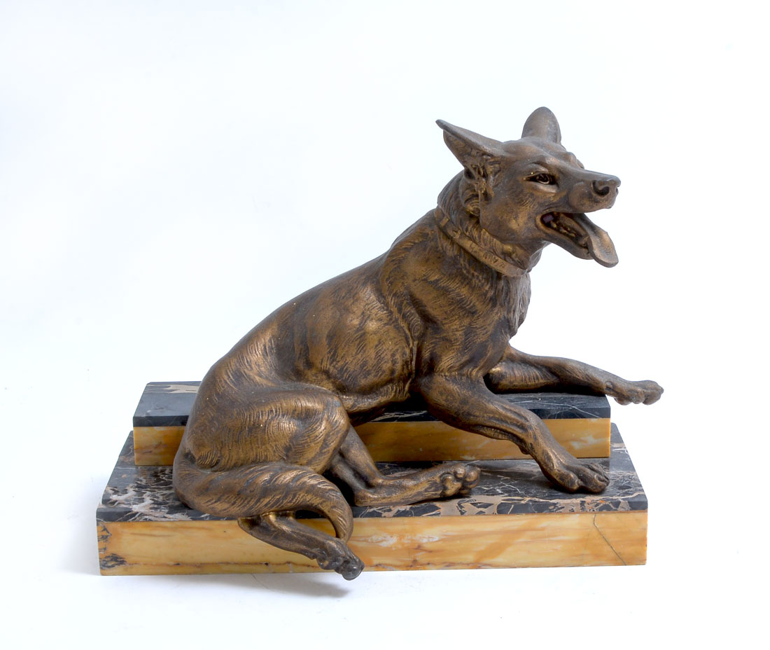 ART DECO PATINATED SPELTER FIGURE OF A GERMAN SHEPHERD: Gold patinated figure of German Shepherd dog, seated on a stepped marble base. Signed on collar L. Carvin, 11'' h. x 15'' h. x 7 1/2''.