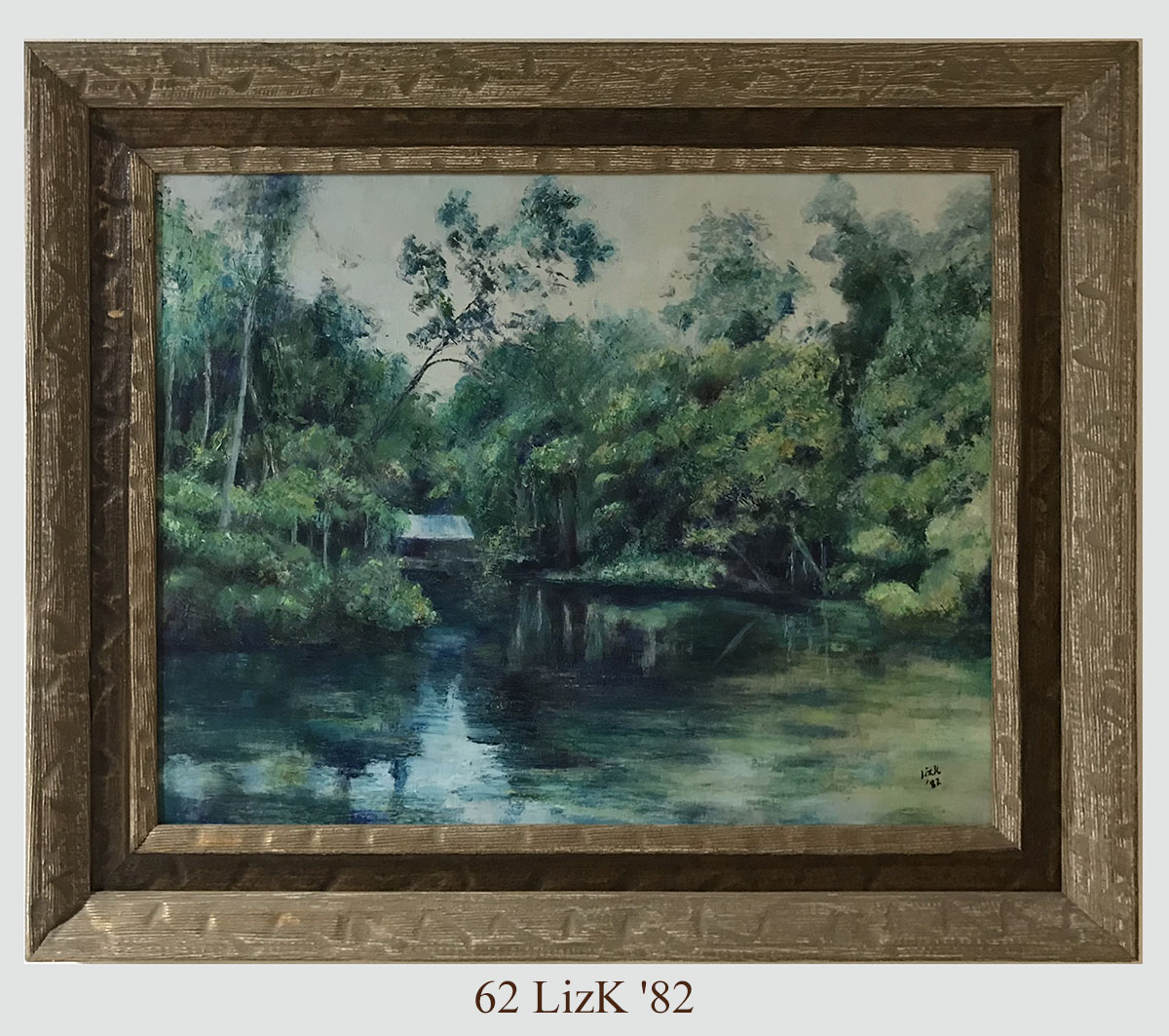 WOODED RIVER SCENE WITH COTTAGE SIGNED LIZK 82