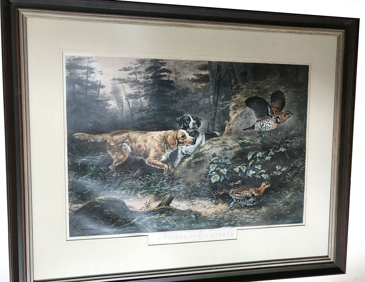 CURRIER AND IVES AMERICAN FIELD SPORTS LITHOGRAPH: ''Flush'd'' from the American Field Sports series featuring 2 dogs flushing quail, sight size 20 1/2'' x 27 1/4'', matted and framed 30 1/2'' x 37 3/4''.
