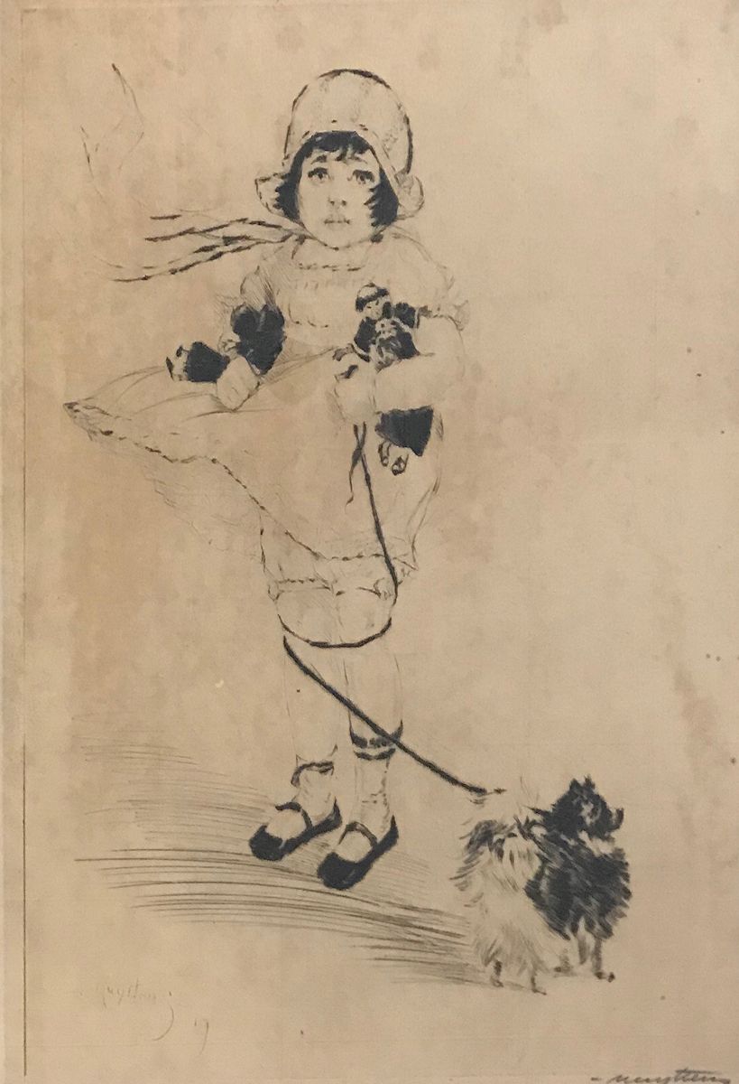 JOSEPH NUYTTENS ETCHING YOUNG GIRL ENTANGLED HER POMERANIAN'S LEASH