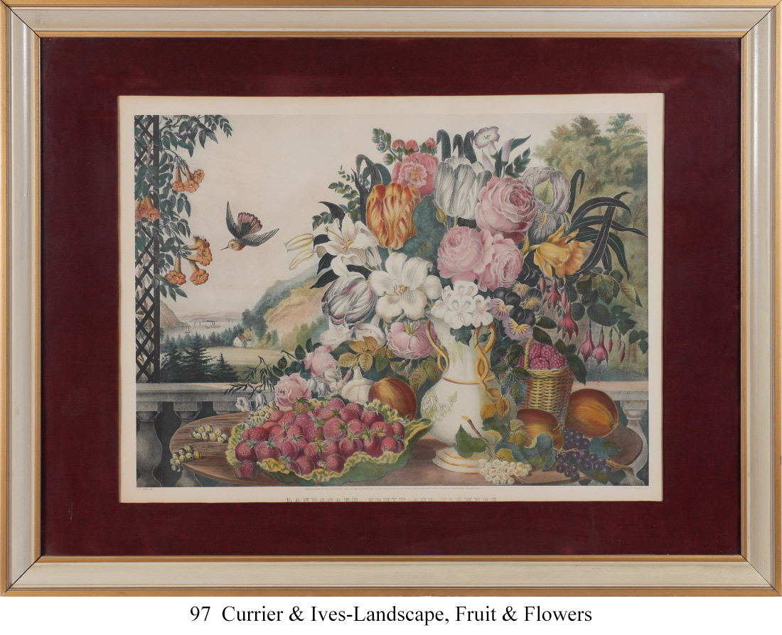 CURRIER AND IVES LITHOGRAPH ''LANDSCAPE, FRUIT AND FLOWERS'': 21.5'' x 29'', framed, 31'' x 41.5''.